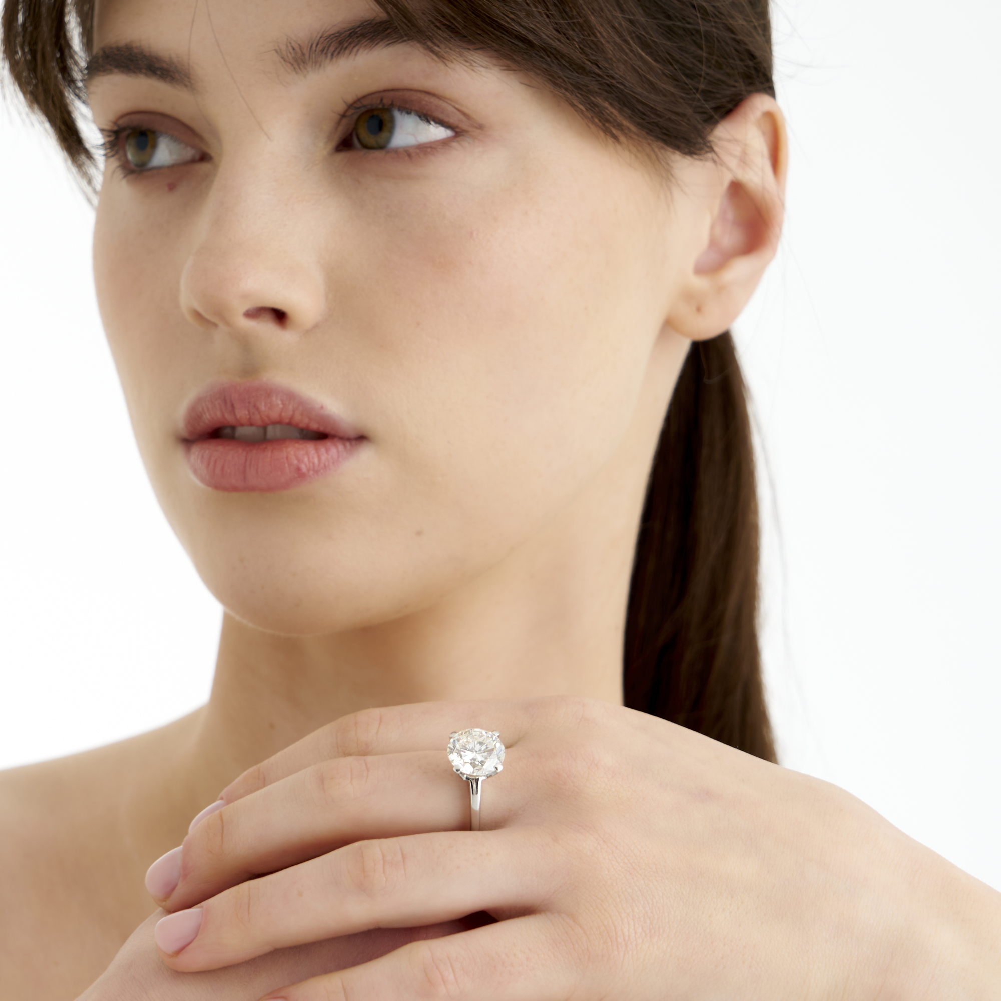 Claw-set with a round brilliant-cut diamond weighing approximately 6.40 carats, size P 1/2, gross weight approximately 7.9 grams.