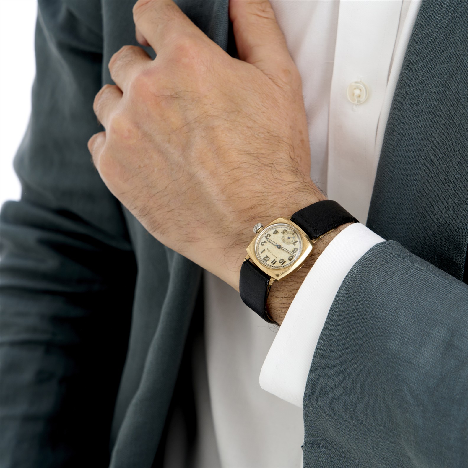 Case: brushed and polished cushion form, fixed wire lugs, screw down crown and case back inscribed I.D.M./28-9-40