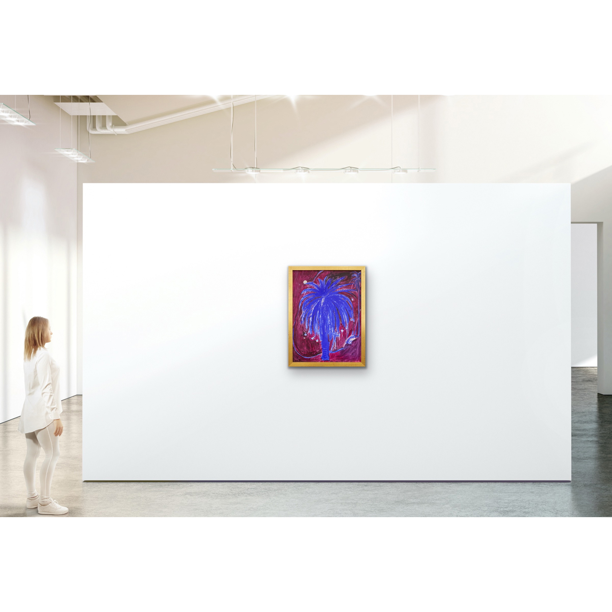 Which brings us to this Sydney coda, whereby at last all clutter and noise from the past are finally quietened. The flattened form of a hallucinatory Canary Island Date Palm silhouetted in blue quietly holds the centre. Tiny boats quiver below in a darkly violet, anaesthetic sea like captive butterflies in a Kunisada woodcut; and a meandering line of ultramarine reminds us the secure Lavender Bay shoreline is not far away. Above, a shy moon peeks from behind a palm frond, the final evidence of a departed sun, leaving us to reflect on Whiteley's essential genius to project when he so chose the dream of a perfect metaphysical moment.