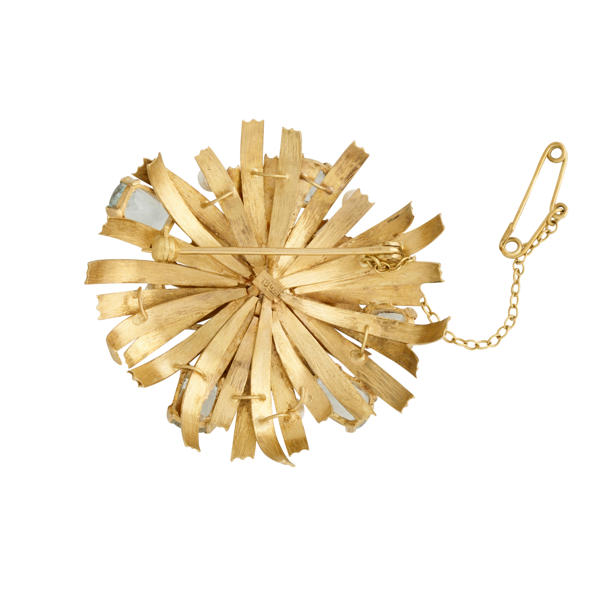 Modelled as a textured flower, detailed with claw-set cushion-cut aquamarines and cultured pearls the aquamarines together weighing approximately 3.50 carats, diameter 50mm, gross weight approximately 19.9 grams.