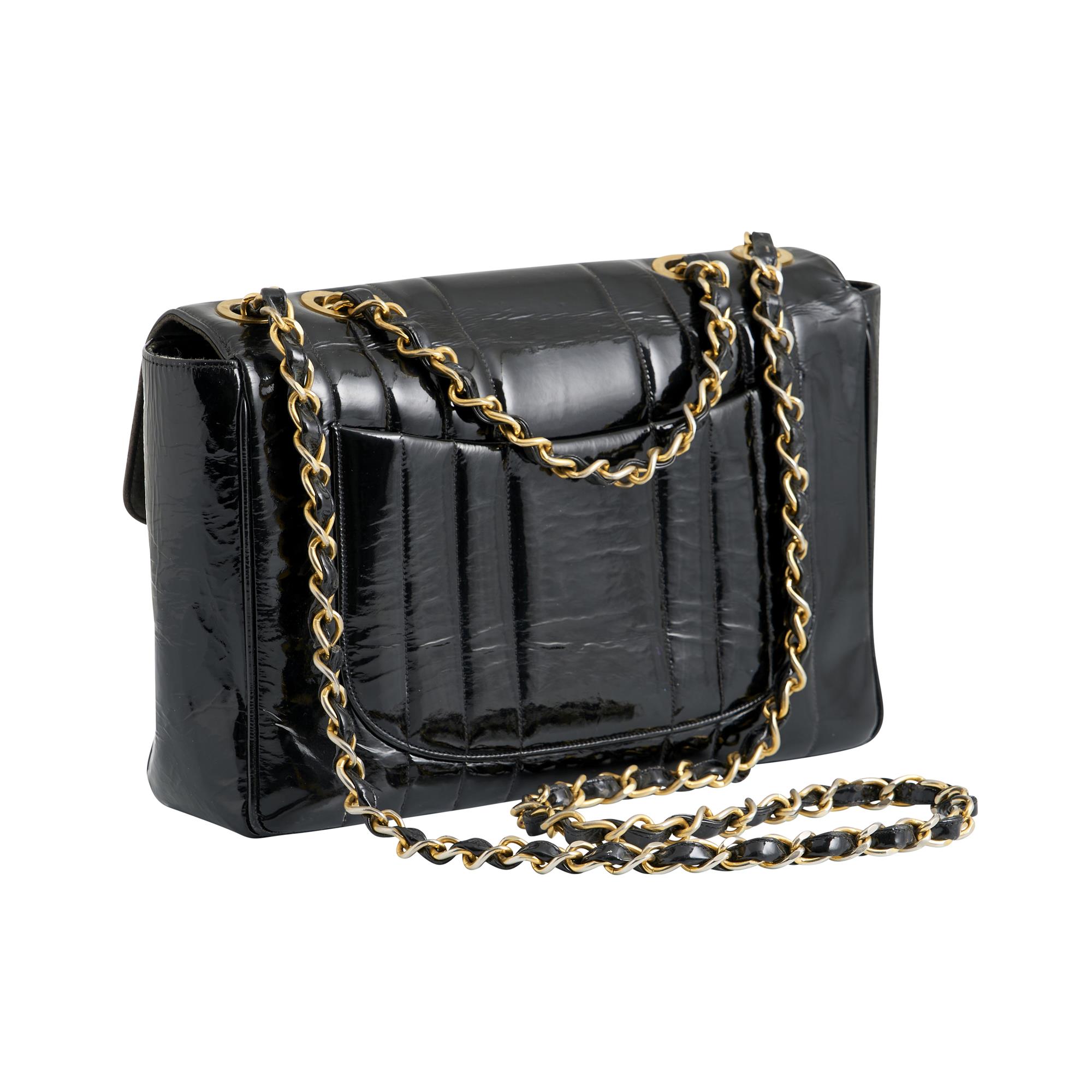 Styled in black patent leather, featuring vertical quilting and oversized gold tone 'CC' turnlock, with leather woven chain strap, single flap, can be worn long or doubled, measures 30 x 22 x 9 cm.
