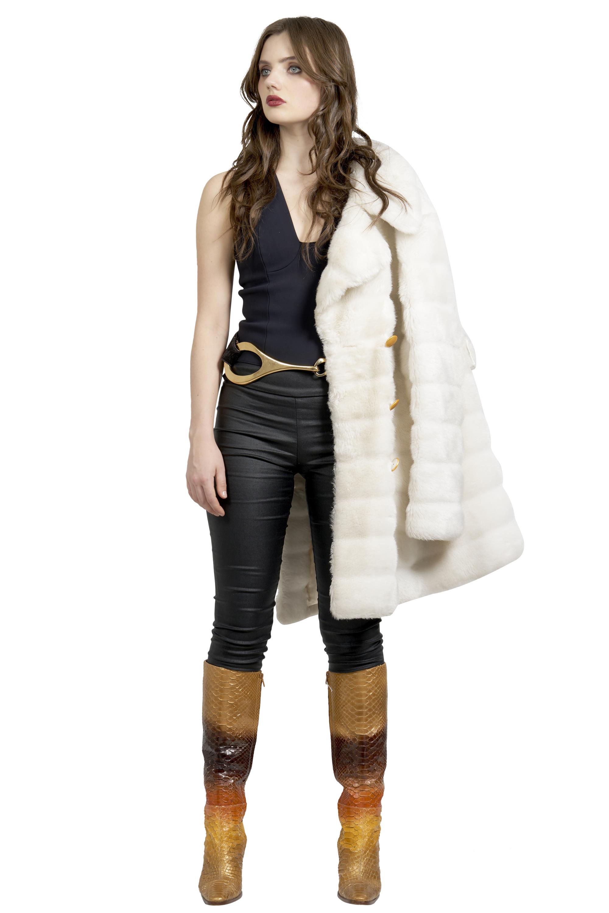Styled in white faux fur, featuring gold dome buttons in glossy golden yellow and tailored in a double breasted design, marked size 42.