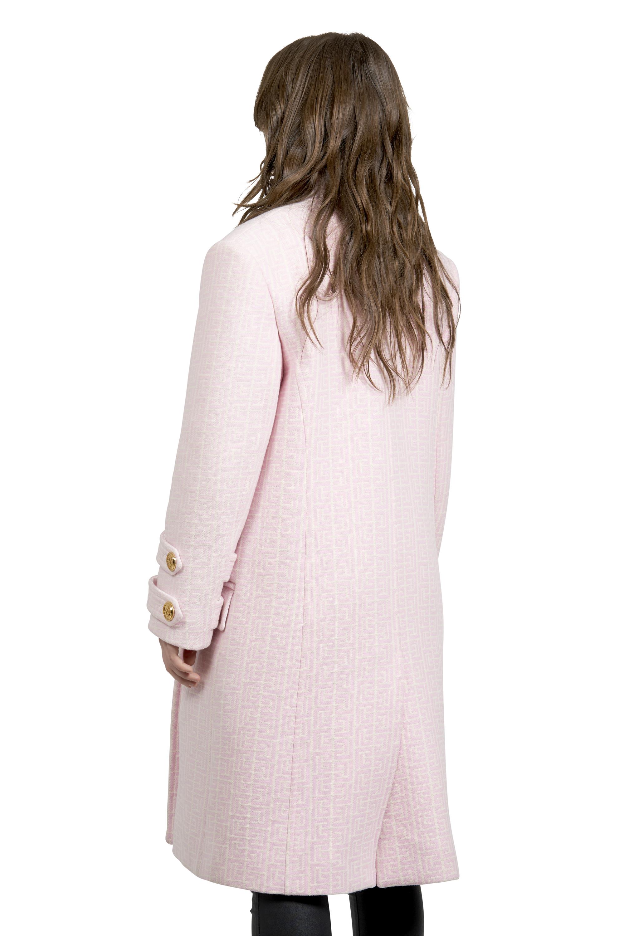 Styled in pink and white monogram wool jacquard, tailored with epaulettes, flap pockets, and gold-tone embossed buttons, fully lined in silk, marked size FR42.
