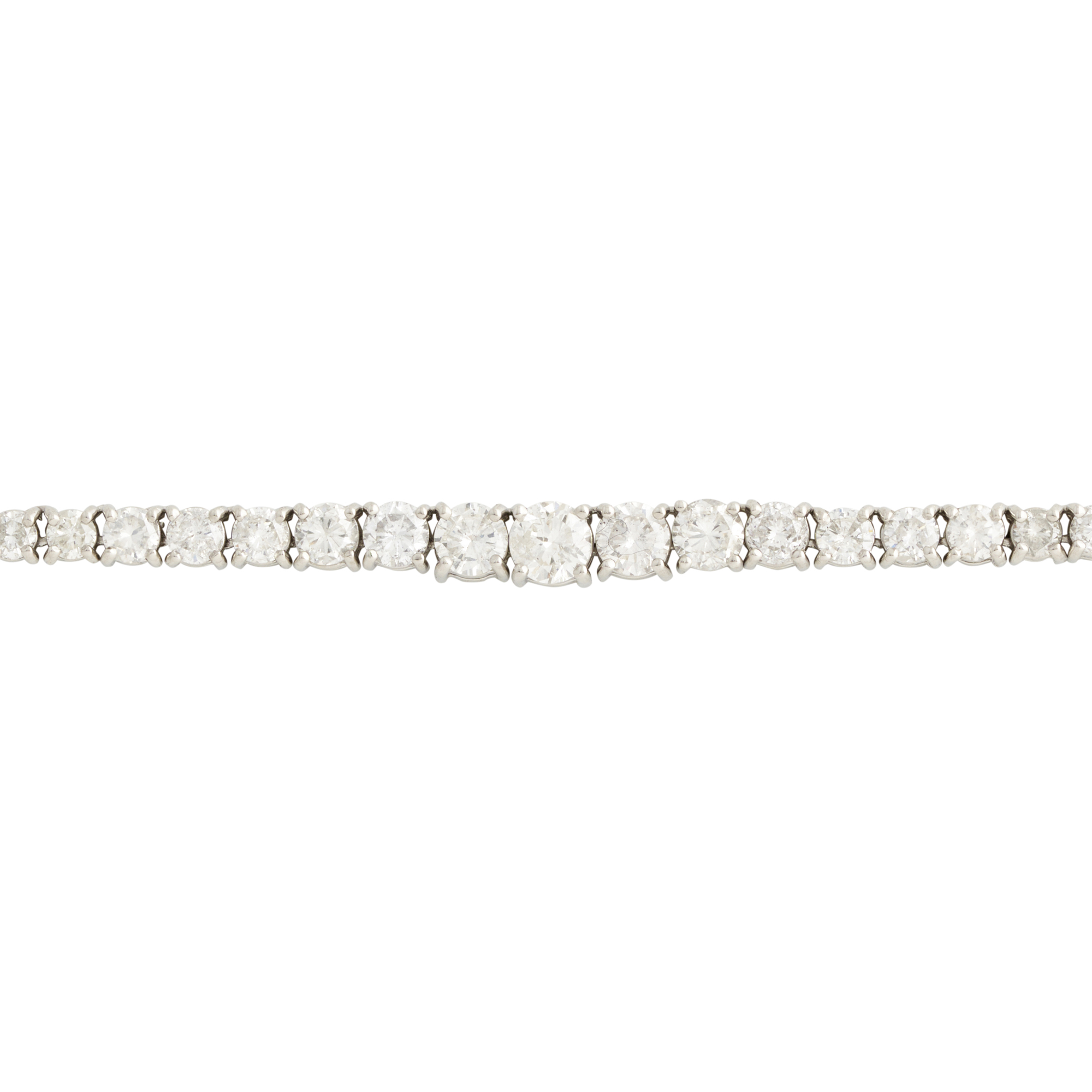 Modelled as a continuous line of one hundred and twenty-seven graduated claw-set round brilliant-cut diamonds together weighing approximately 12.11 carats, completed by a concealed box clasp, length 440mm, gross weight approximately 36.6 grams.