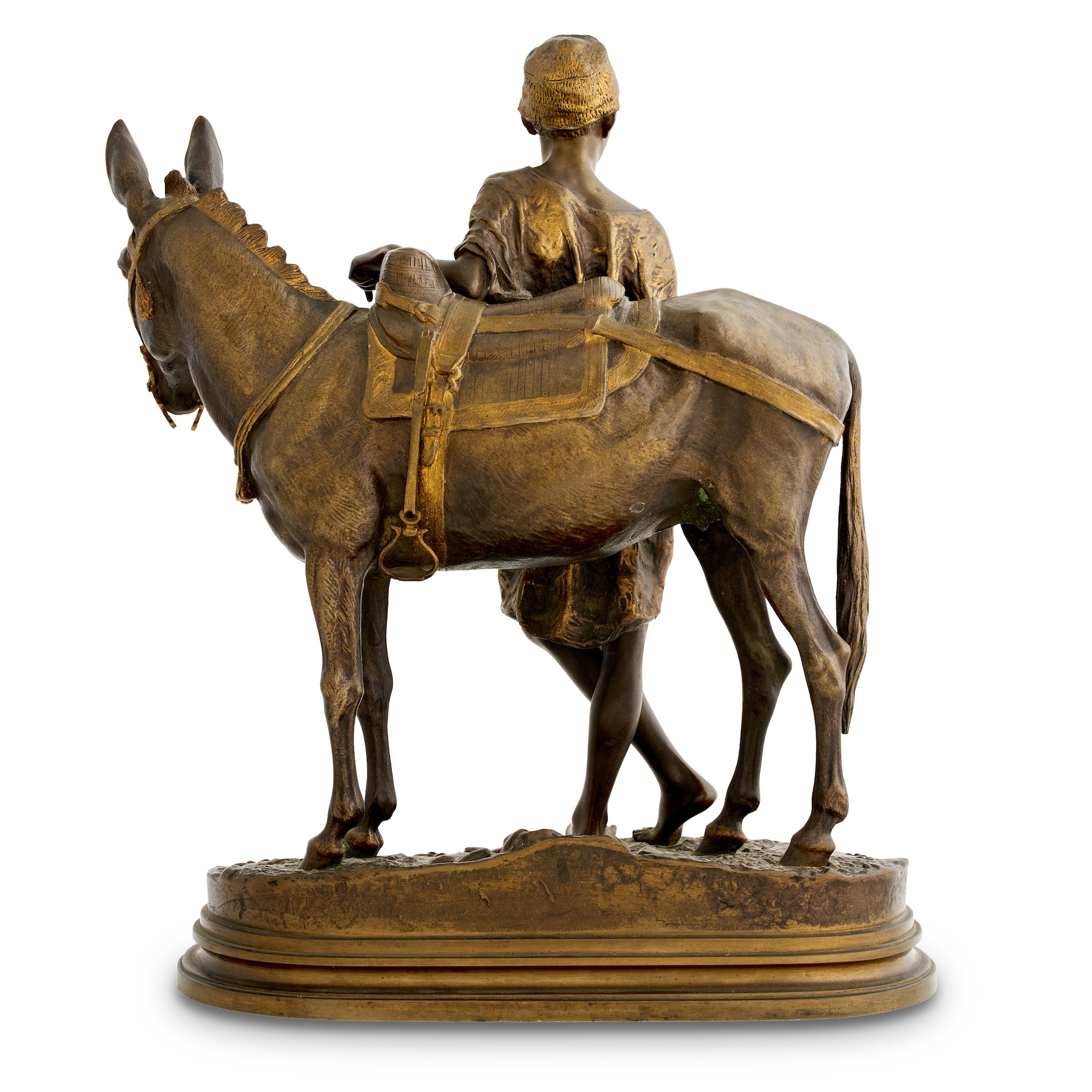 The right stirrup is lacking, as are the reins (both as visible in the catalogue photo). The sculpture is otherwise well presented consistent with age and handling, the original patination (a little darker than it might appear in the catalogue photos) and gilt details well preserved, with no more than typical light handling wear on high points.