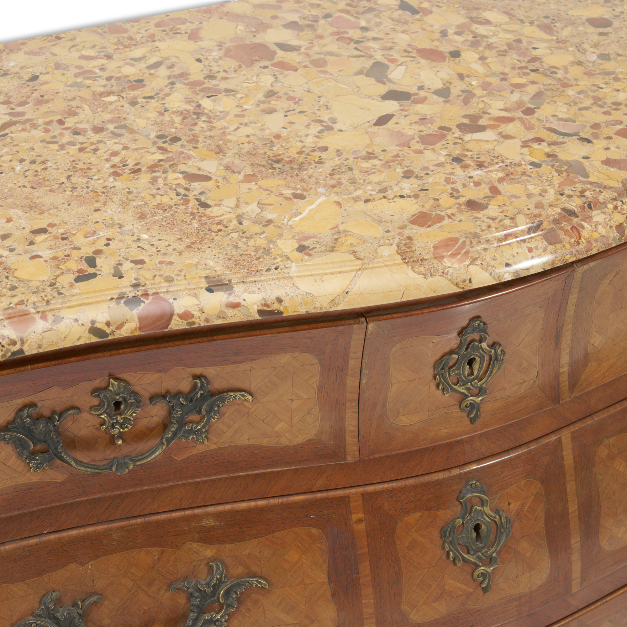 Of 'tombeau' shape, the thick breche d'Alep marble top with moulded edge above three short and two long drawers, on swept feet between shaped aprons, the front and sides veneered with geometric fields
