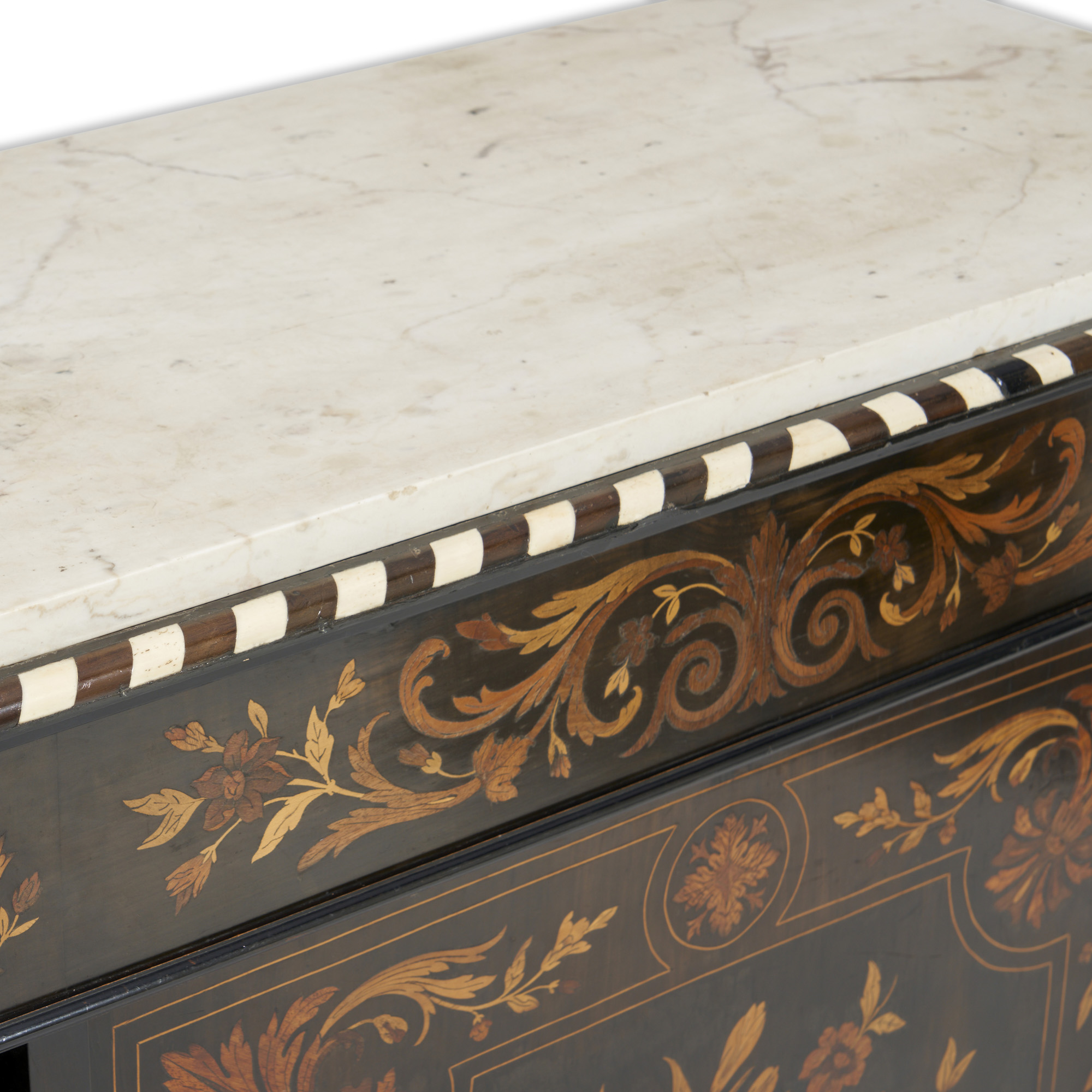 In late seventeenth century Dutch manner, the veined white marble top above a single door enclosing removable shelves flanked by spiral-turned columns, on a plinth base with ball feet, the front inlaid in various contrasting woods with a vase of flowers and other floral designs, the edge of the top and plinth inlaid with bone