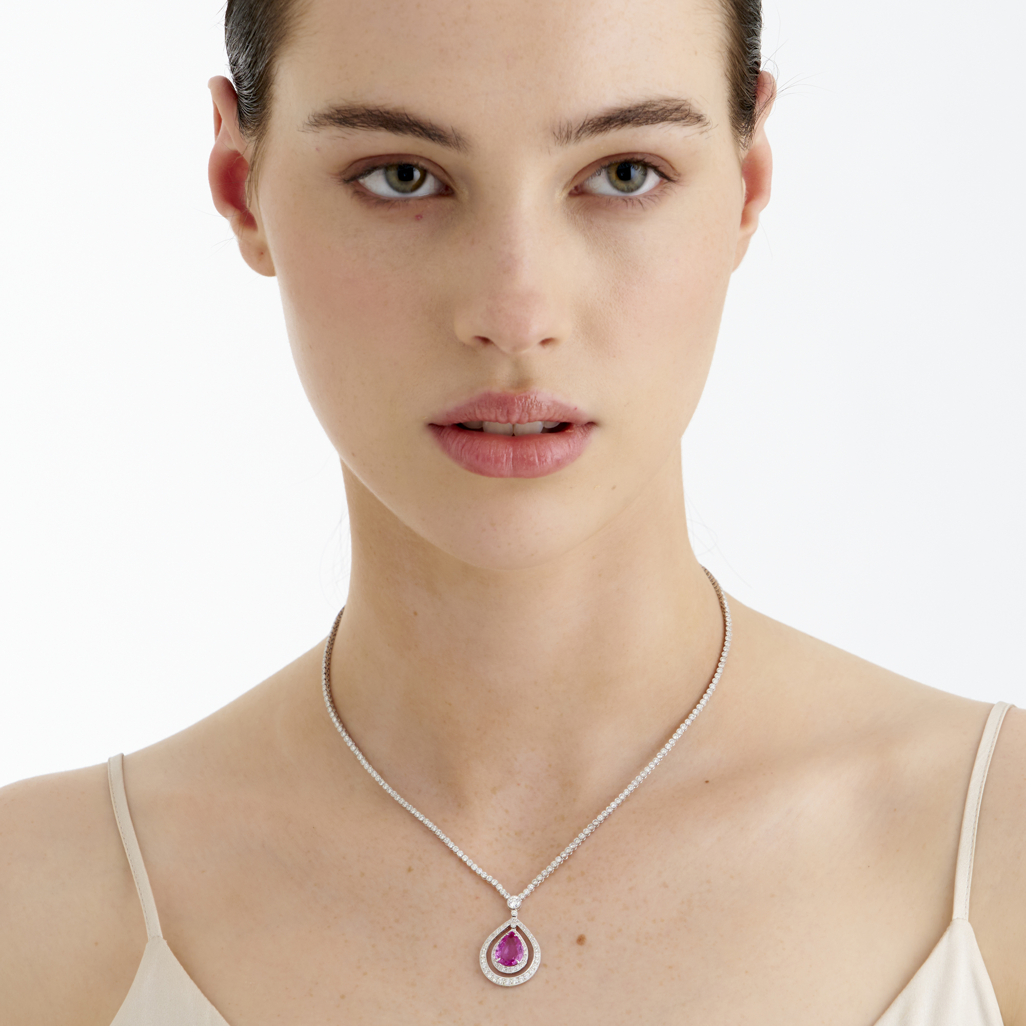 Centring a claw-set pear-cut pink sapphire within a surround of milgrain-set round brilliant-cut diamonds, suspended within an open pear-shaped diamond surround, to an integral necklace of collet-set round brilliant-cut diamonds and completed by a feature oval-cut diamond cluster tongue and groove clasp, the sapphire weighing approximately 3.00 carats, the oval-cut diamond weighing approximately 0.62 carats, the round brilliant-cut diamonds together weighing approximately 3.54 carats, signed Fred Leighton, length 42mm, gross weight approximately 19.8 grams.