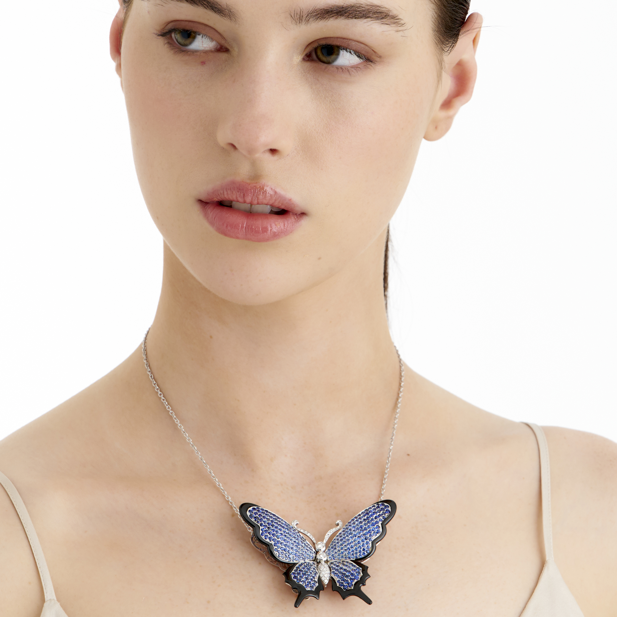 Modelled as an articulated butterfly, the body and antenna detailed with bezel, pavé and milgrain-set round brilliant-cut diamonds, the wings detailed with graduating pavé-set circular-cut sapphires in graduating blue hues within a border of polished onyx, the diamonds together weighing approximately 0.75 carats, the sapphires together weighing approximately 10.30 carats, to a double platinum chain completed by a parrot clasp, pendant length 55, width 76mm, necklace length 430mm, gross weight approximately 43.4 grams.
