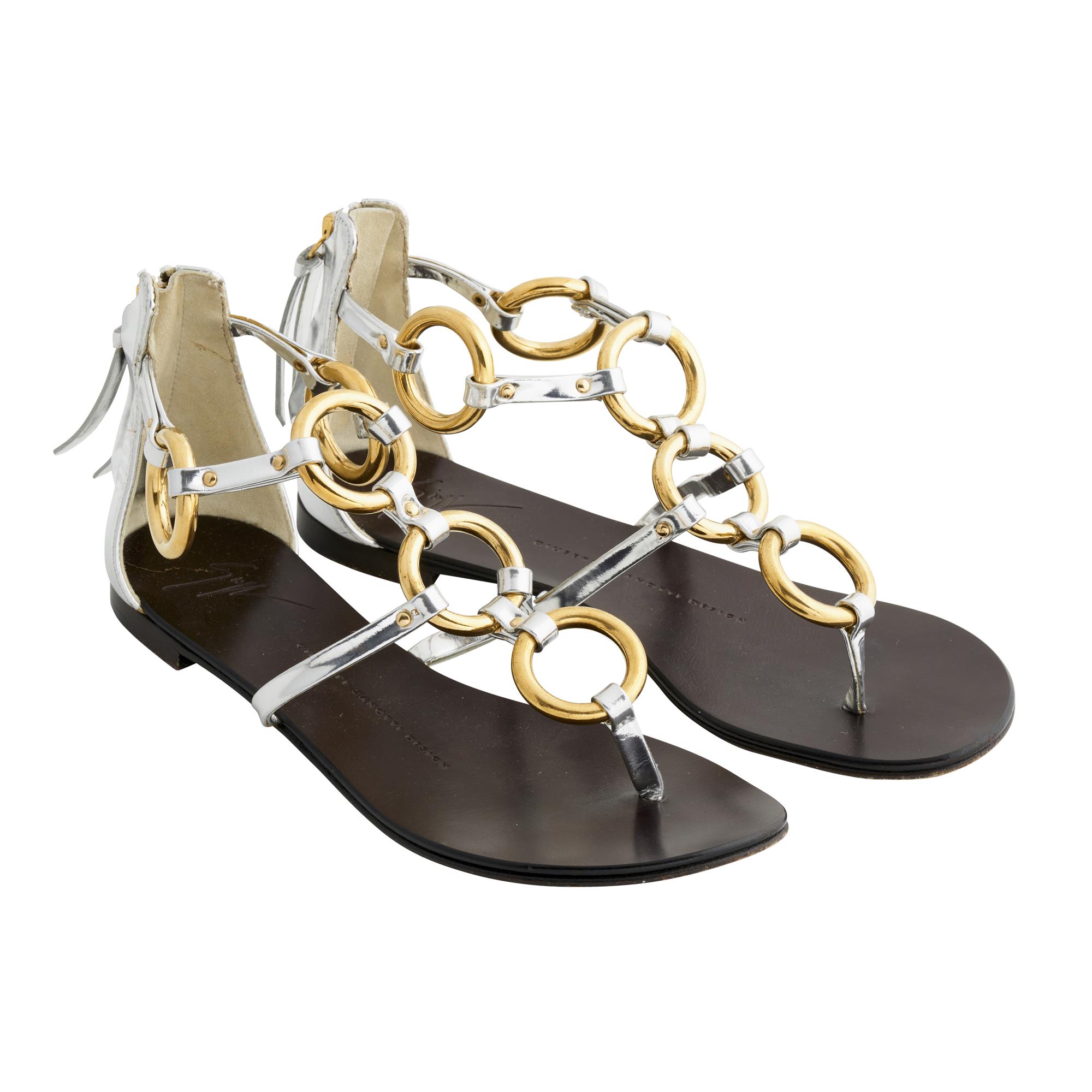 Comprising of a pair of thong sandals styled in silver leather featuring a gold ring embellishment, marked size 37; together with a pair of thong sandals styled in black leather with gold tone metal spike detail at the back, marked size 37.