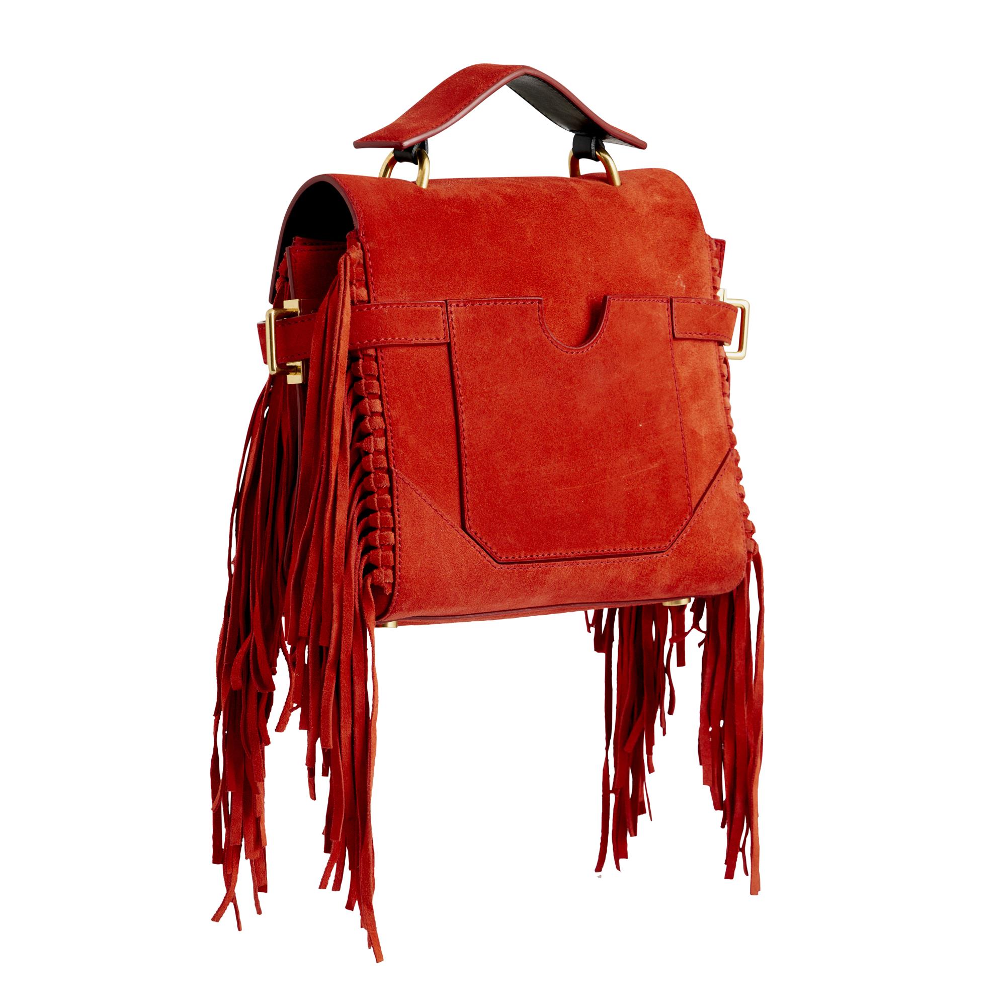 Styled in orange suede, featuring fringe sides, gold-tone "B" logo clasp, and studded strap details, with top handle and detachable shoulder strap, measures 24 × 22 × 9cm.