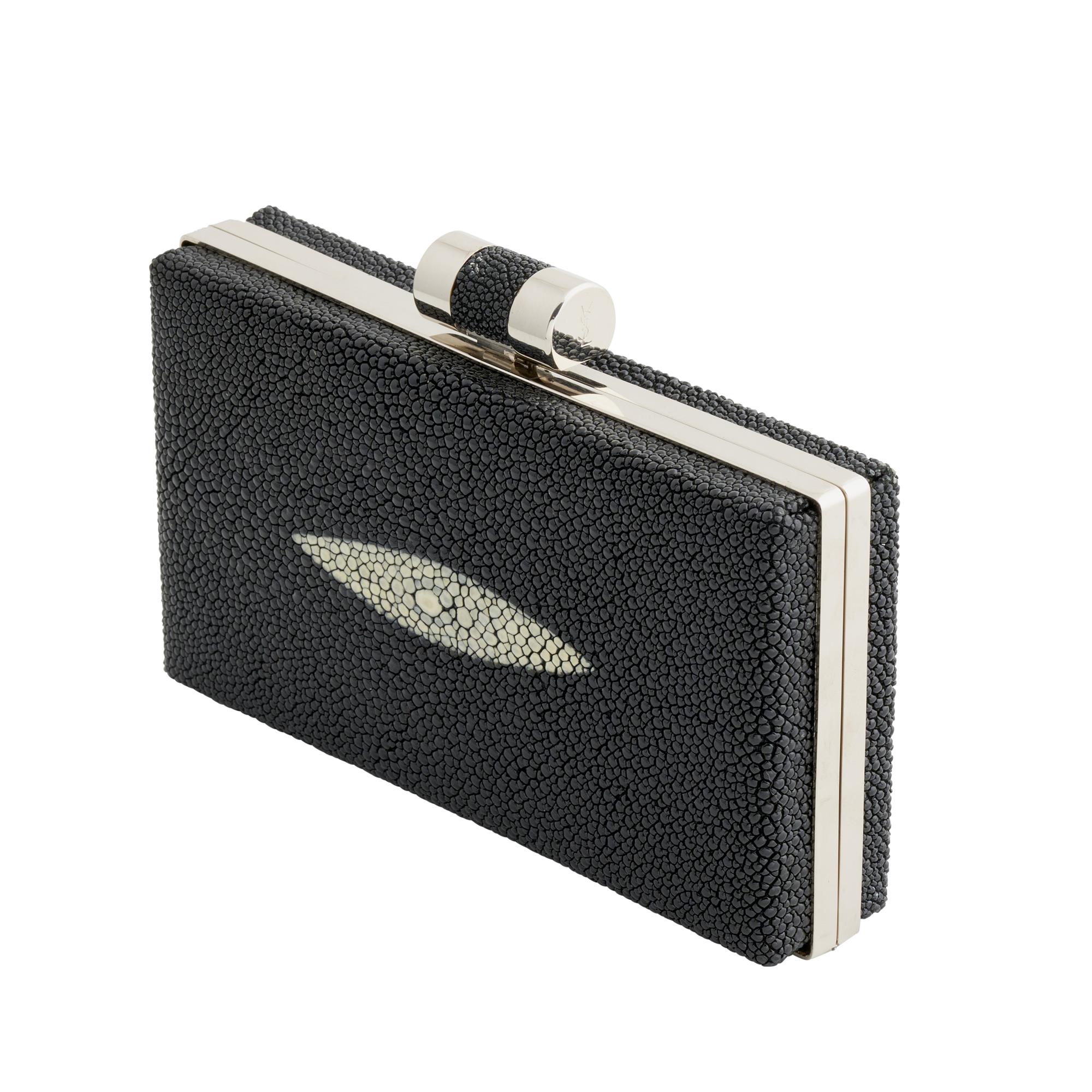 Styled in black stingray galuchat featuring natural central eye motif and silver-tone clasp fastening, measures 15 x 9 x 3cm.