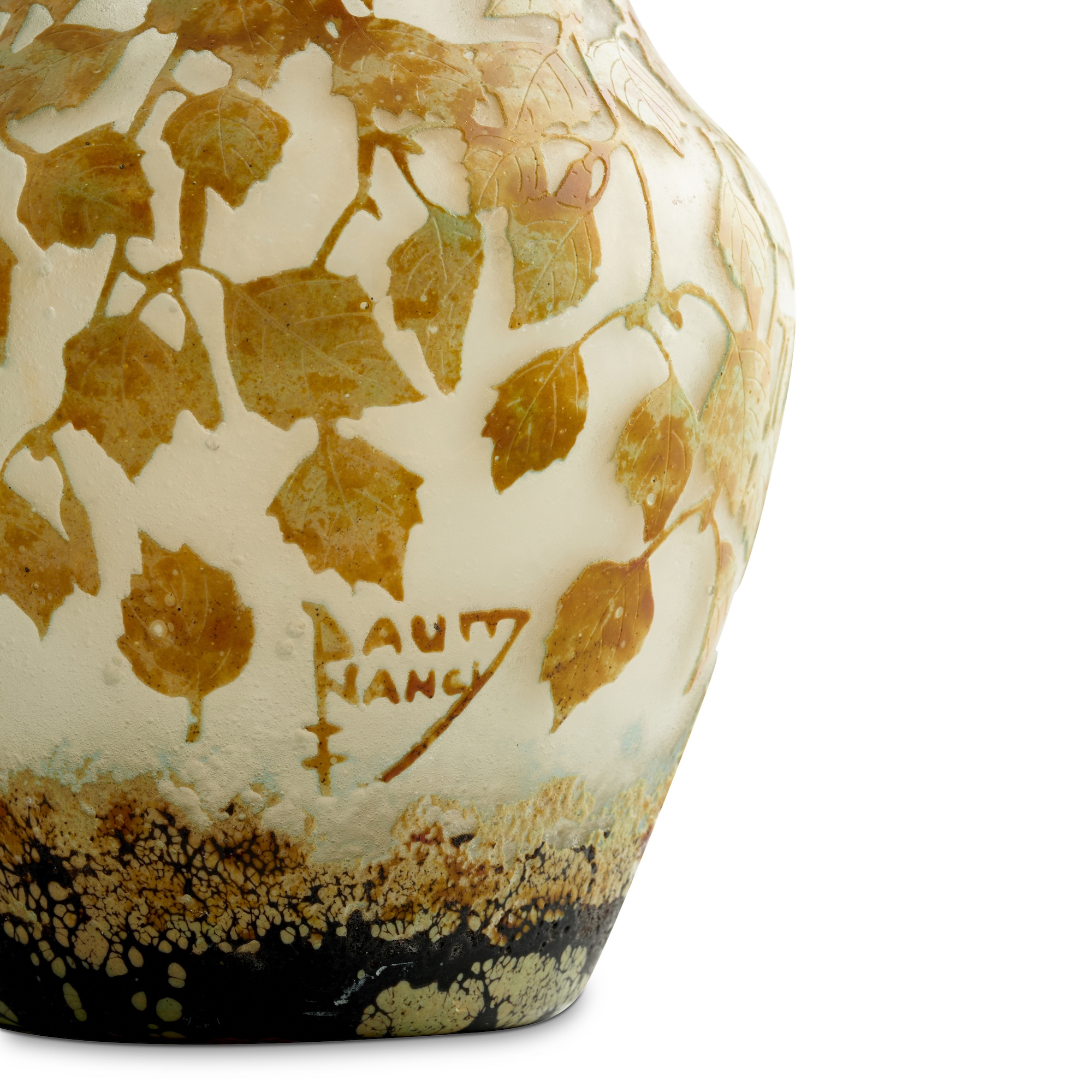 Tapering, acid-etched and enamelled, decorated with autumnal leaves on cased colourless glass ground with white and blue powder inclusions, cameo mark 'Daum Nancy' with the Croix de Lorraine