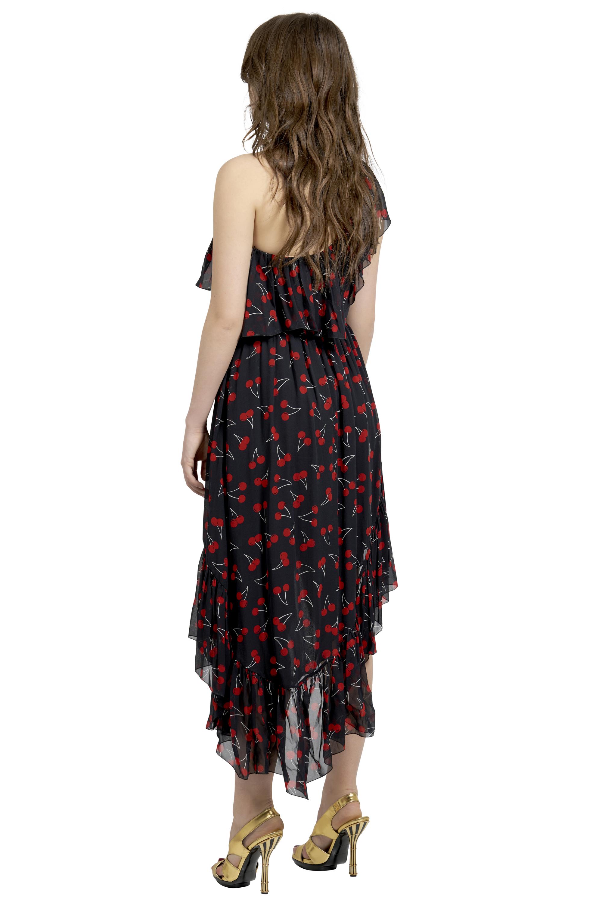 Styled in black chiffon silk with red cherry print, with asymmetric one shoulder, ruffled trim and tiered high-low ruffled hem, marked size FR 36.