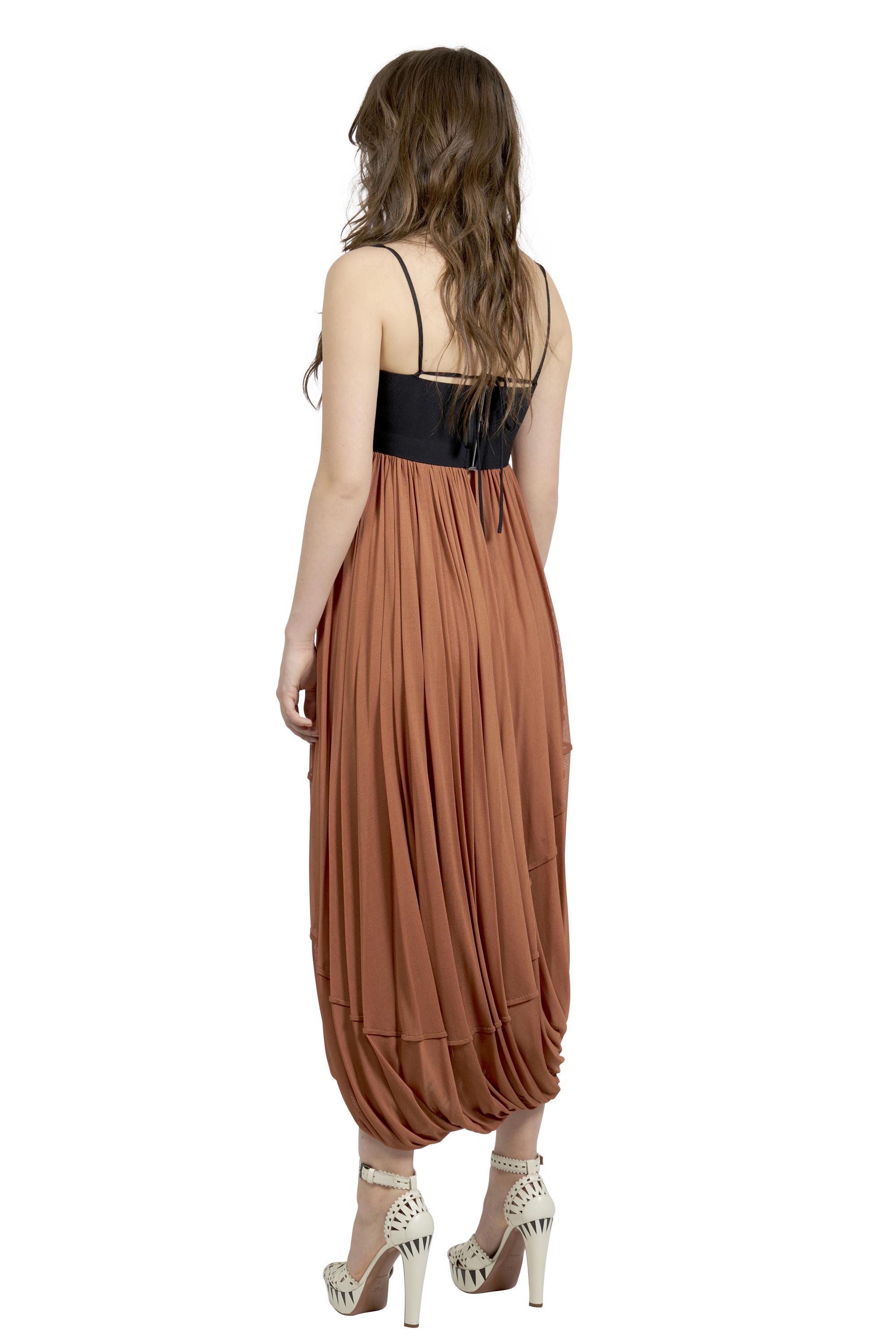 Styled in a viscose blend with black knit bodice and spaghetti straps above a voluminous rust orange gathered bubble hem skirt, marked size FR38.
