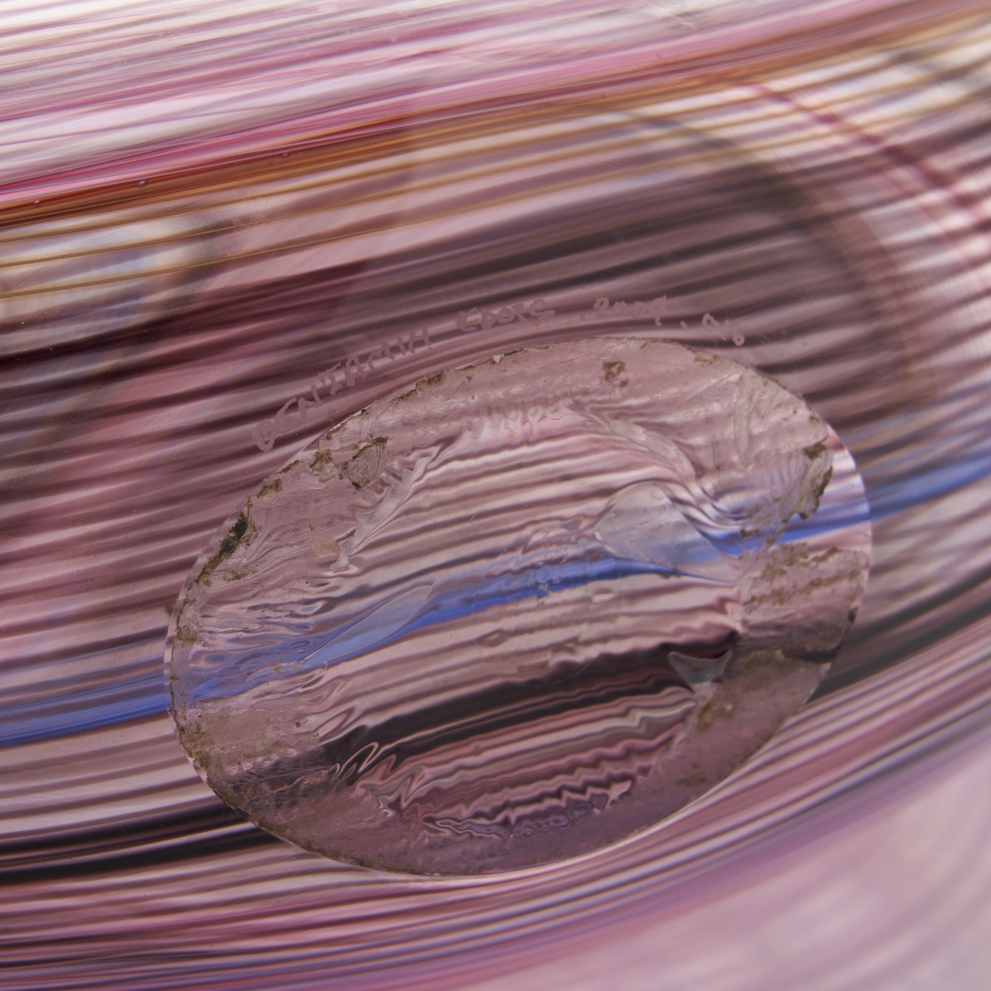 Discoid form with filligrana in shades of violet and mauve. Signed and dated to base edge.