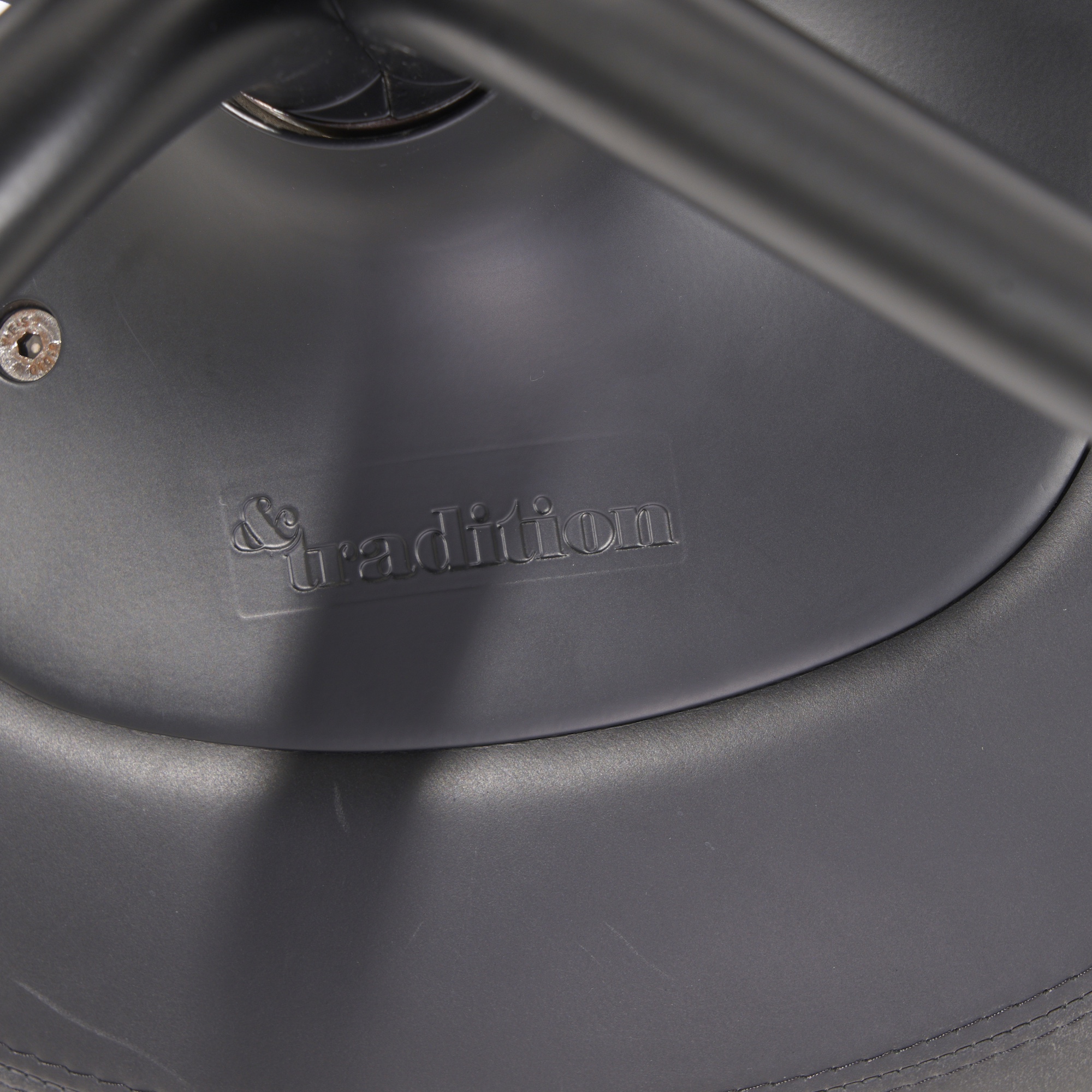 Black leather upholstered organic form contoured seat with integrated armrests on black powder coated four point base.