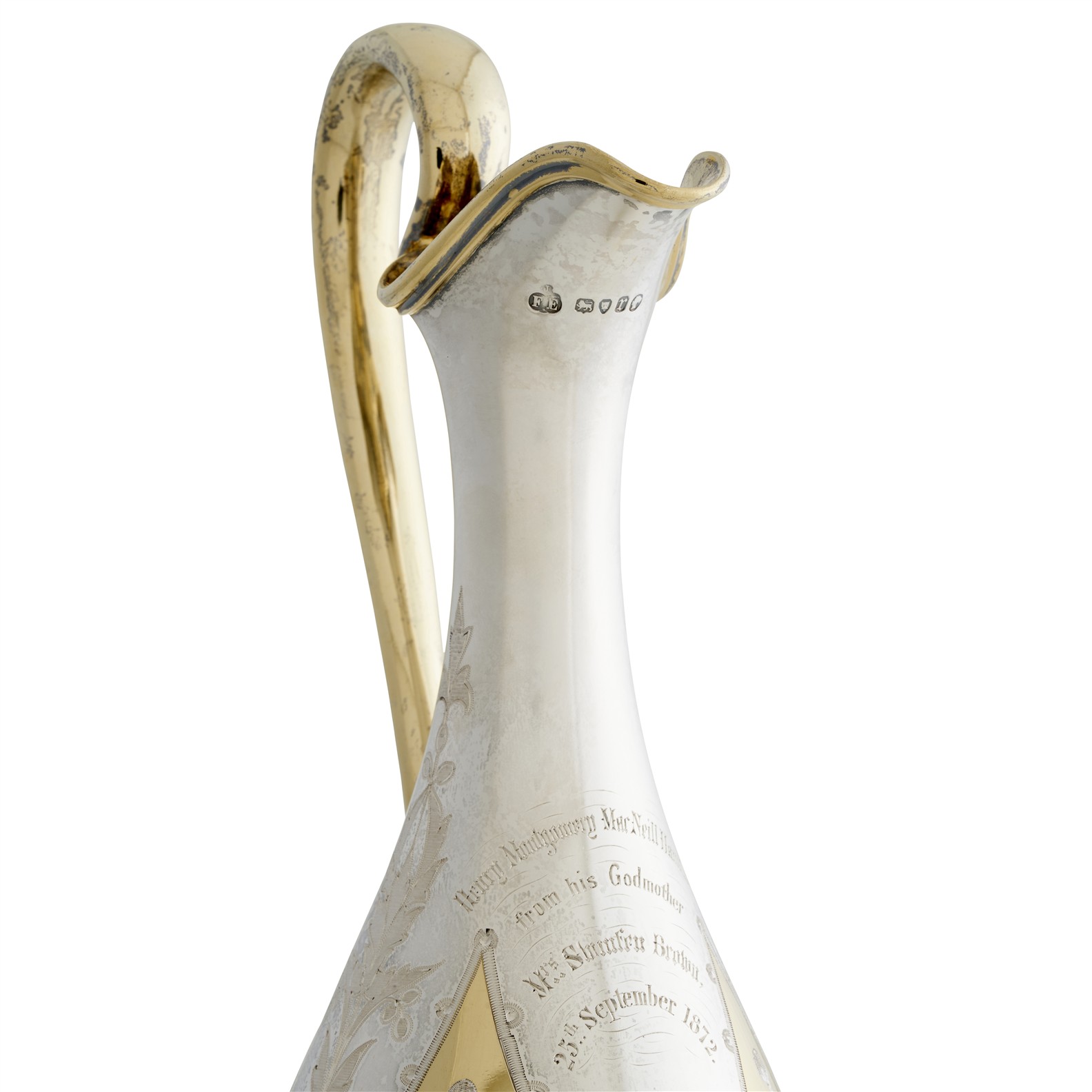 Baluster-shaped with a high loop handle on a circular foot, the body decorated with bright-cut flowers and foliage within pointed lappets rising from the foot, the handle, mouth and its Toft's Patent weighted cover, lappets, and foot all gilt contrasting with the matte silver ground, engraved below the spout 'Henry Montgomery MacNeill Hamilton / from his Godmother / Mrs Swinfen Brown / 25th September 1872', the Barnard mark in the group beneath the spout overstruck with that of Elkington & Co. (leaving the Barnard mark to the underside of the foot undisturbed)