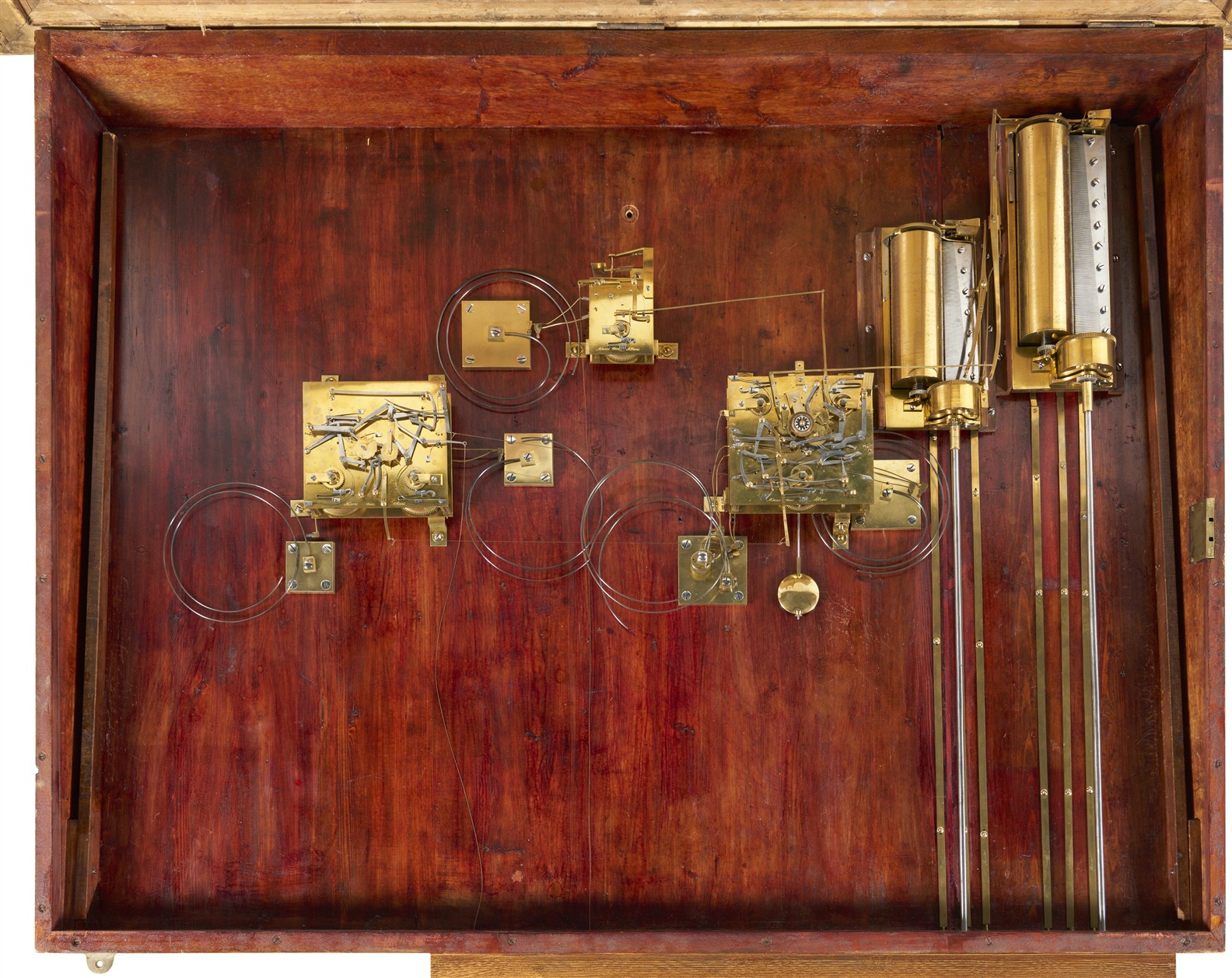 The eight-day clock movement with grande and petite sonnerie and two subsidiary movements, respectively quarter-striking and single-striking, with a black and white japanned Roman numeral dial cut through a British School oil on canvas painting to appear as the clock in the tower of a Gothic church in an extensive capriccio Scottish lake landscape with monks and cattle in a fine, apparently original period frame (regilt), the clock movements housed in large box hinged to the rear of the picture frame together with the two key-driven single-cylinder musical movements, the controls for the latter accessible from the underside