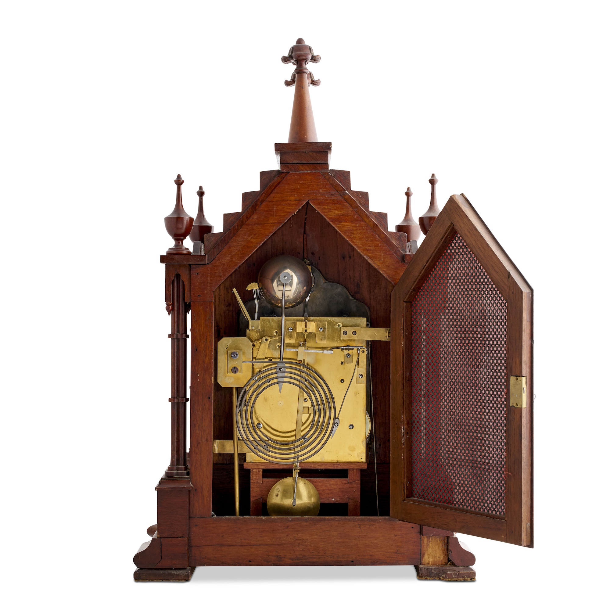 The triple fusee movement quarter striking on eight bells and hour striking on a gong, the shaped silvered and engraved Roman numeral dial with subsidiary chime / silent dial within a glazed cover in an upright case of architectural design in Gothic Revival style with finials to the crow's step parapets above clustered columns to the corners on the moulded plinth base