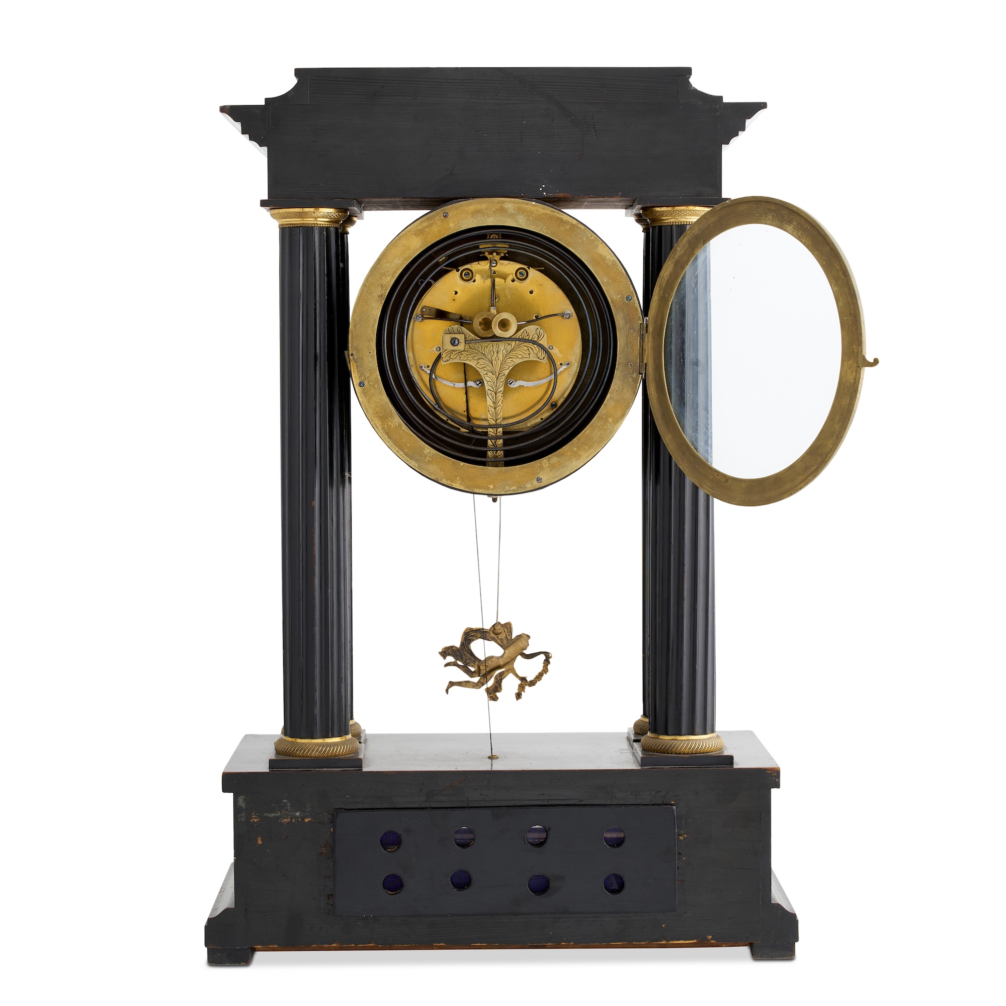 The two-day movement with silk suspension, quarter striking on two gongs, the enamelled Roman numeral dial with subsidiary Arabic calendar dial in a glazed bezel within a drum case raised with the pendulum in the form of a figure of Cupid in an ebonised wood Doric portico of four columns, the plinth housing the musical movement visible through a gilt metal-mounted glazed aperture cover