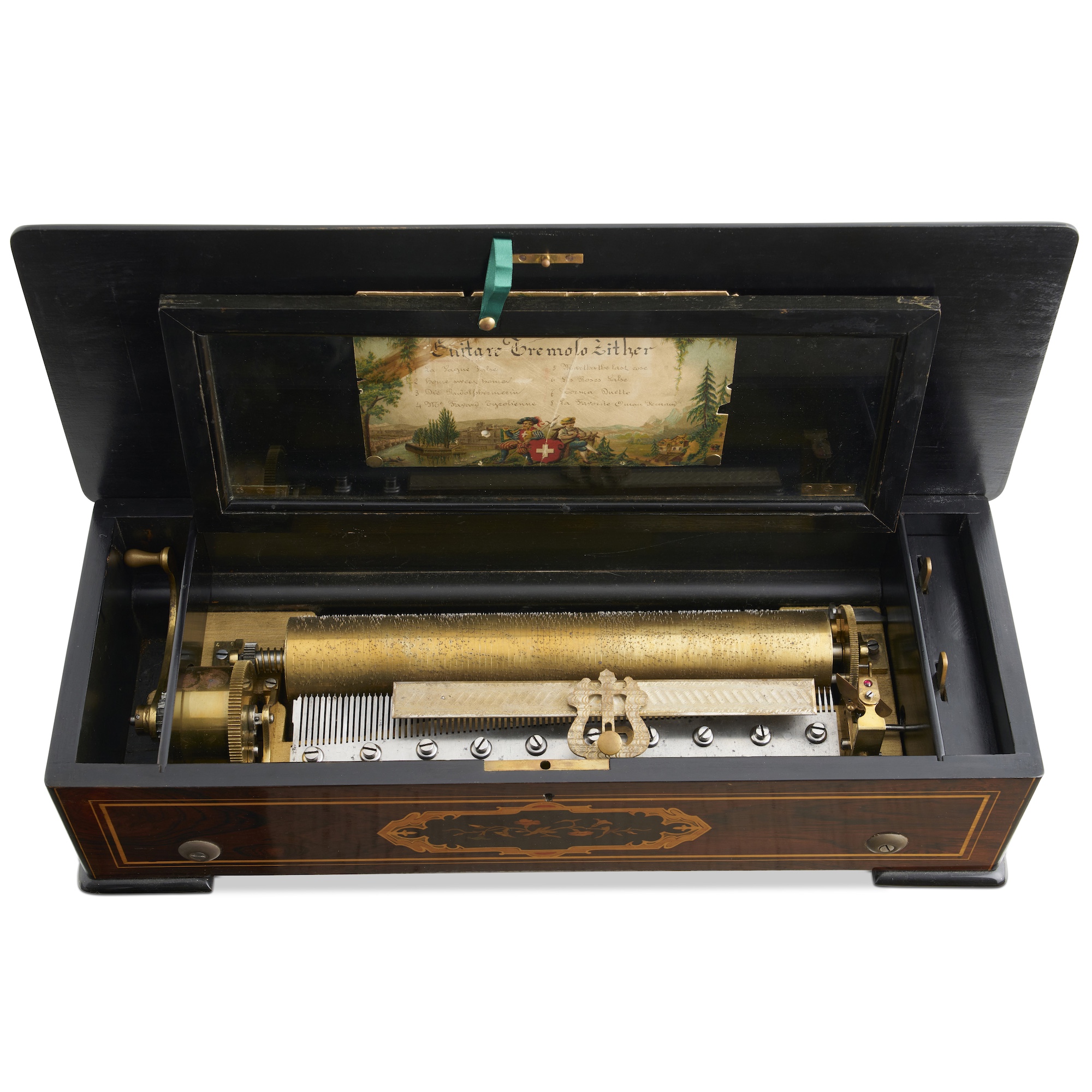 AN ANTIQUE SWISS GUITAR TREMOLO ZITHER EIGHT-AIR MUSIC BOX