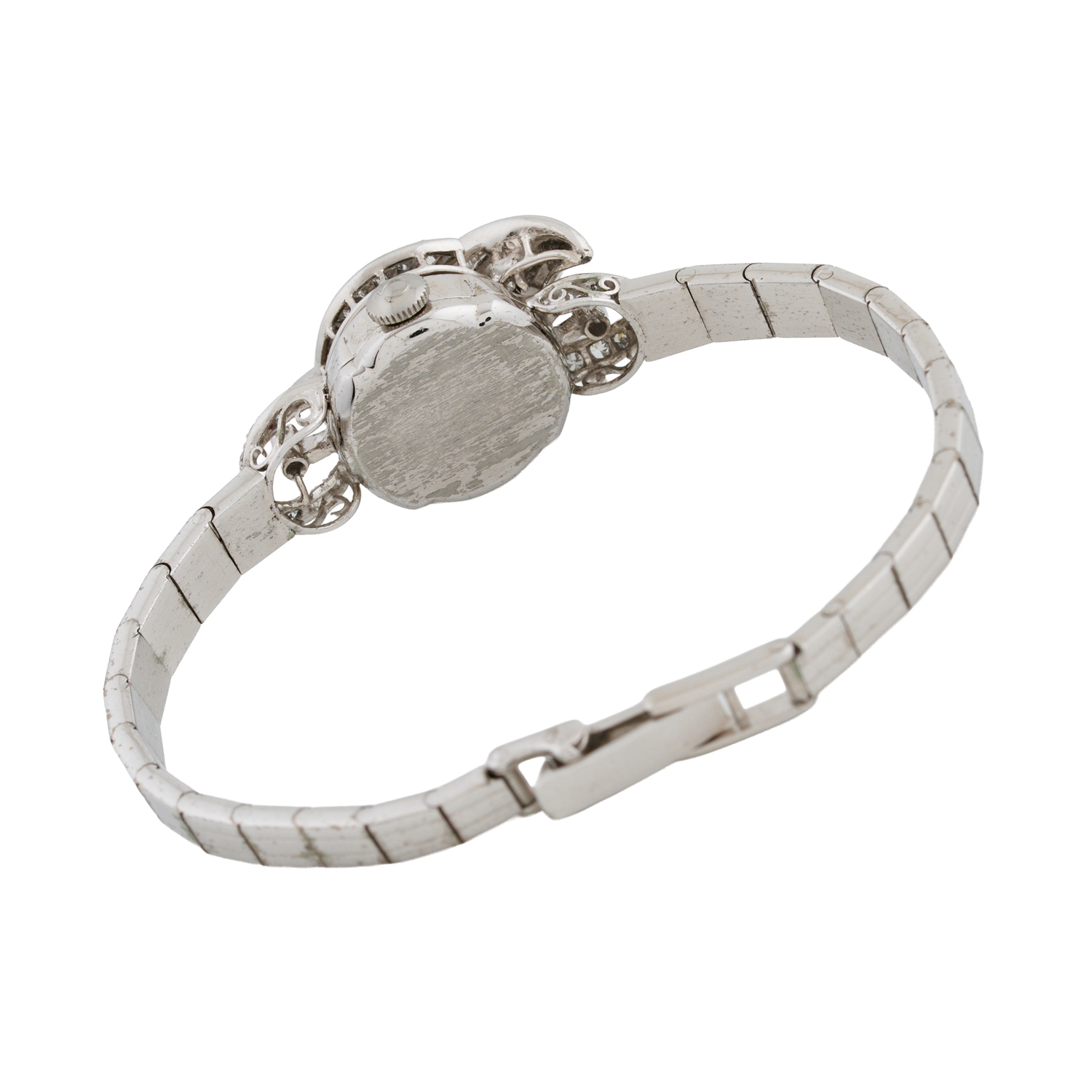 Case: brushed and polished shaped, diamond-set hinged cover of foliate ribbon design, snap on case back