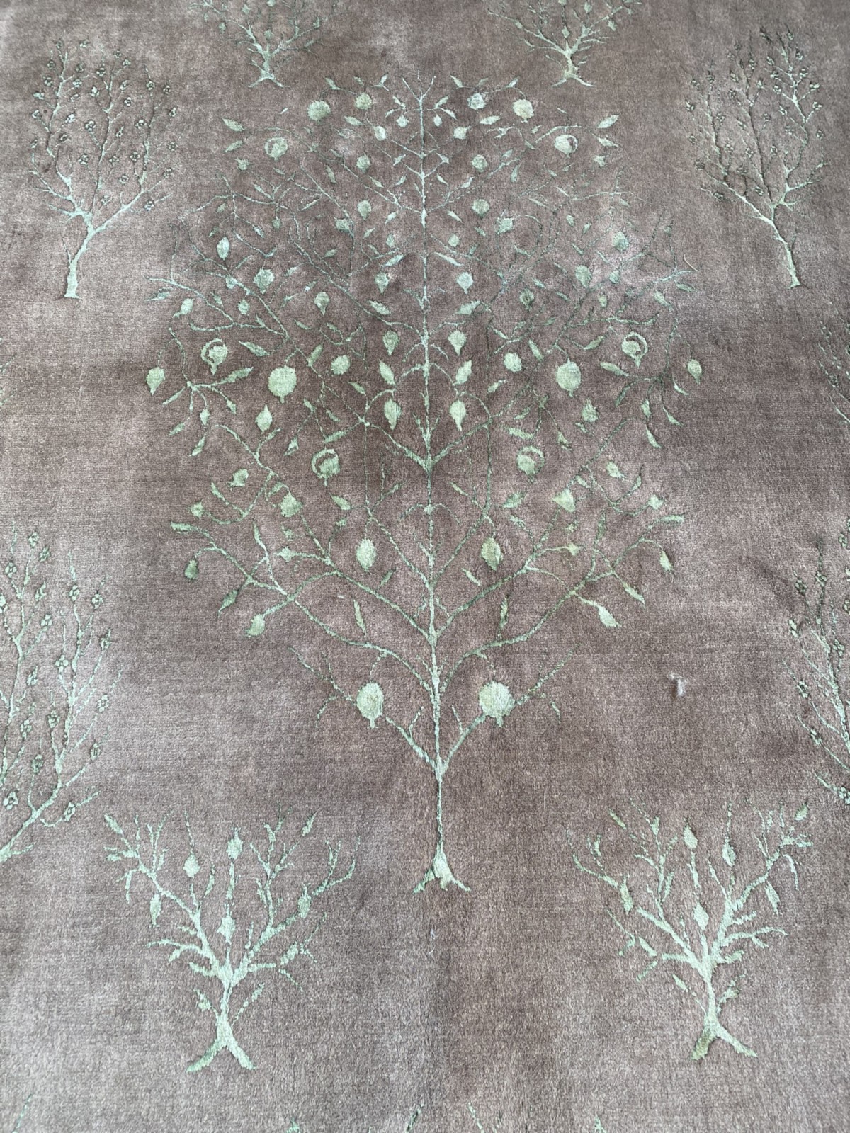 HANDMADE LOOM KNOT WOOLLEN PILE HIGHLIGHTED WITH SILK TEXTURE FIBRE. PICTORIAL TREE OF LIFE DESIGN WITH A CENTRAL POMEGRANATE TREE SET AGAINST CYPRESS TREES. GALLERY DISPLAYED.