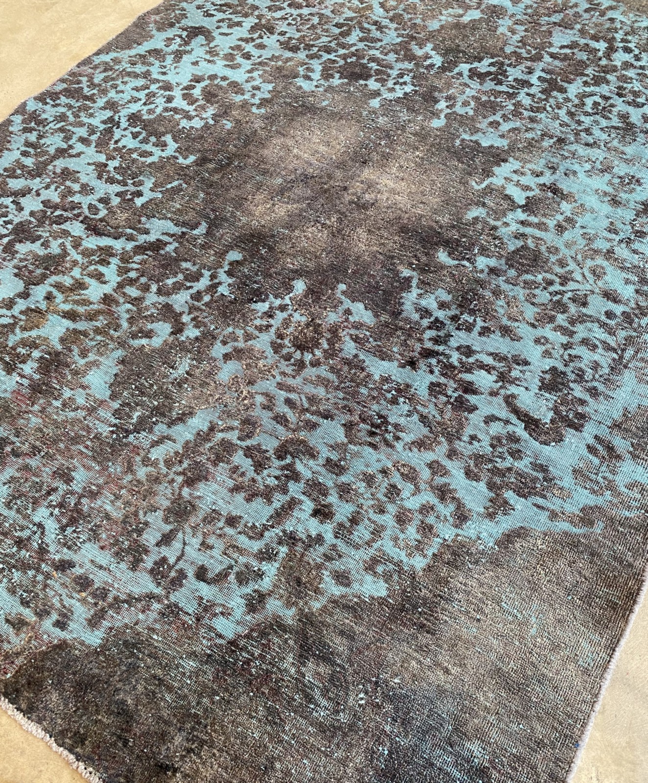 VINTAGE PILE WITH EMBOSSED PATTERNS CREATED FROM AN ORIGINAL HAND-KNOTTED MEDALLION DESIGN TABRIZ CARPET OVER-DYED IN SHADES OF TURQUOISE & CHARCOAL WITH BURGUNDY HIGHLIGHTS.