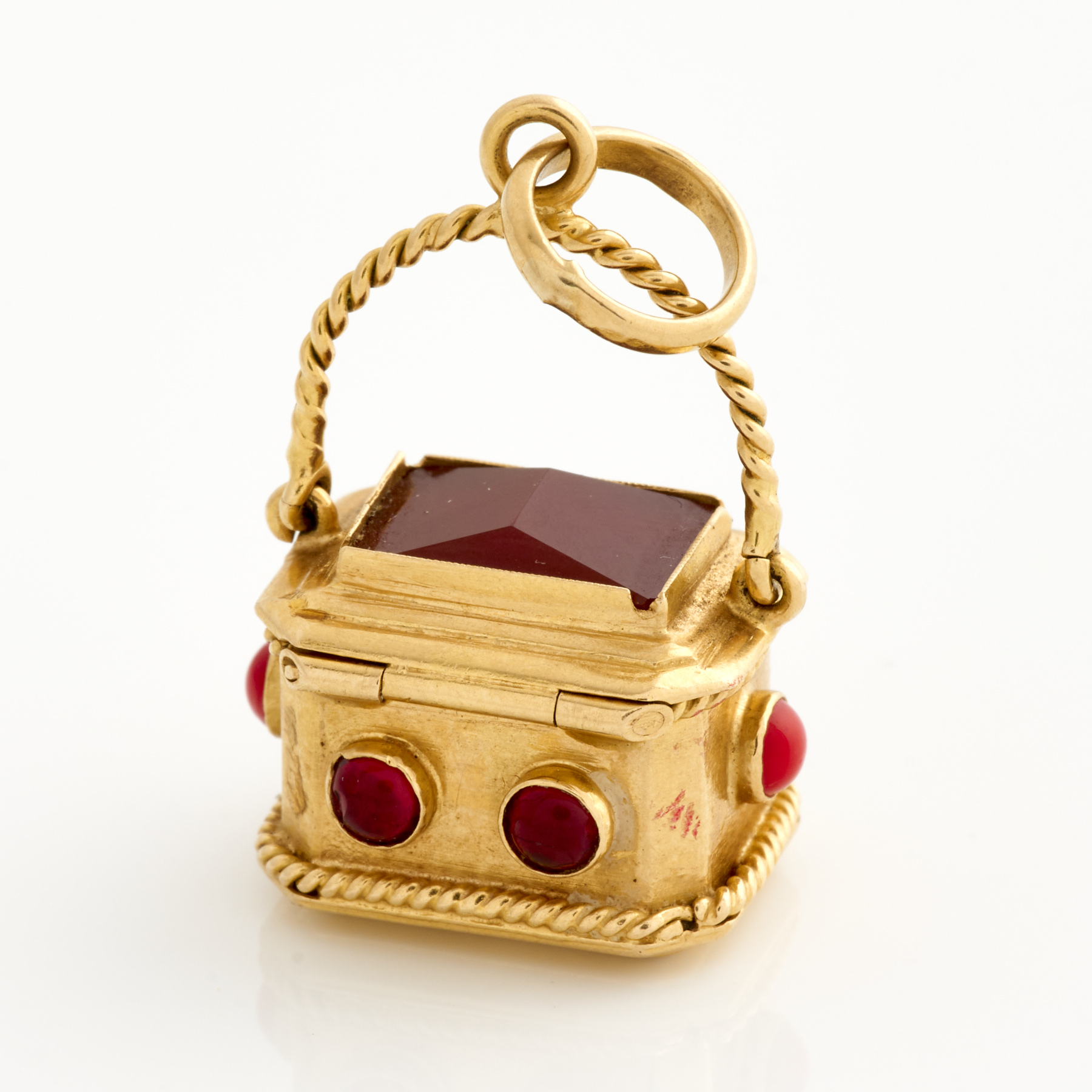 A CARNELIAN, TURQUOISE AND GEM SET CHEST PENDANT IN 18CT GOLD, 8.89GMS, A/F
