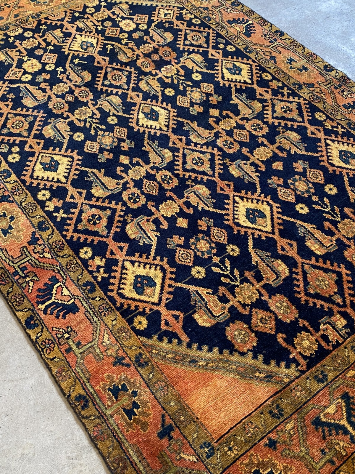 A HAND WOVEN NOMADIC WEAVE FROM THE LORESTAN PROVINCE WITH WOOL AND VEGETABLE DYES & NATURAL ABRASH COLOUR VARIATION. NOMADIC DESIGN OF ALL-OVER BOLD HERATI MAHI PATTERNS IN AN INDIGO FIELD. BORDER OF PALMETTES.