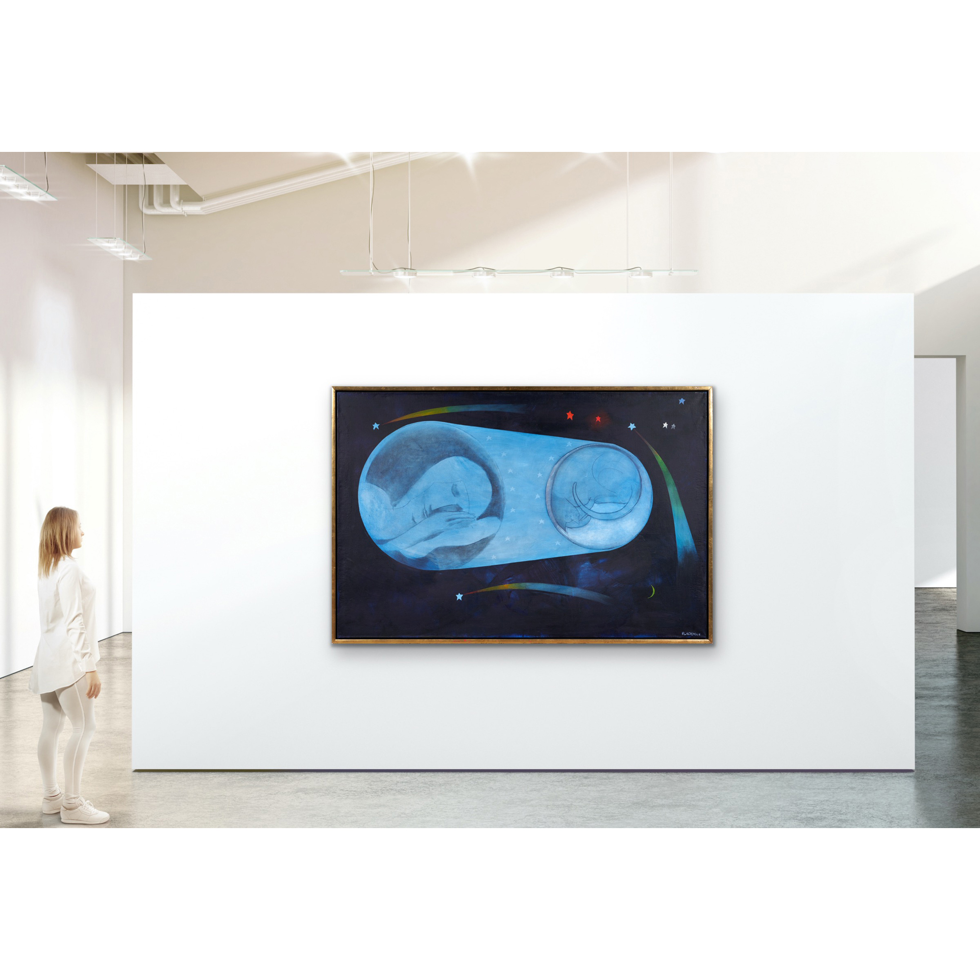 Charles Blackman's Celestial series of the mid-1980s reflects his long fascination with the night sky and star-gazing with is children. Works such as 'Night's Dream Celestial Mirror' and 'Celestial Figure' 1984 combine jewel-like blue grounds with floating constellations, flowers, and his familiar motifs of the female form and the cat. Inspired by moon-watching in Japan and Barbara Warren Kenton's 'Astrology: A Celestial Mirror' 1974, Blackman projected his own imaginative symbols into the zodiac. These dreamlike paintings resonate with lyrical Surrealism, recalling Miró, while offering a poetic interpretation of life where fact and imagination are inseparable.