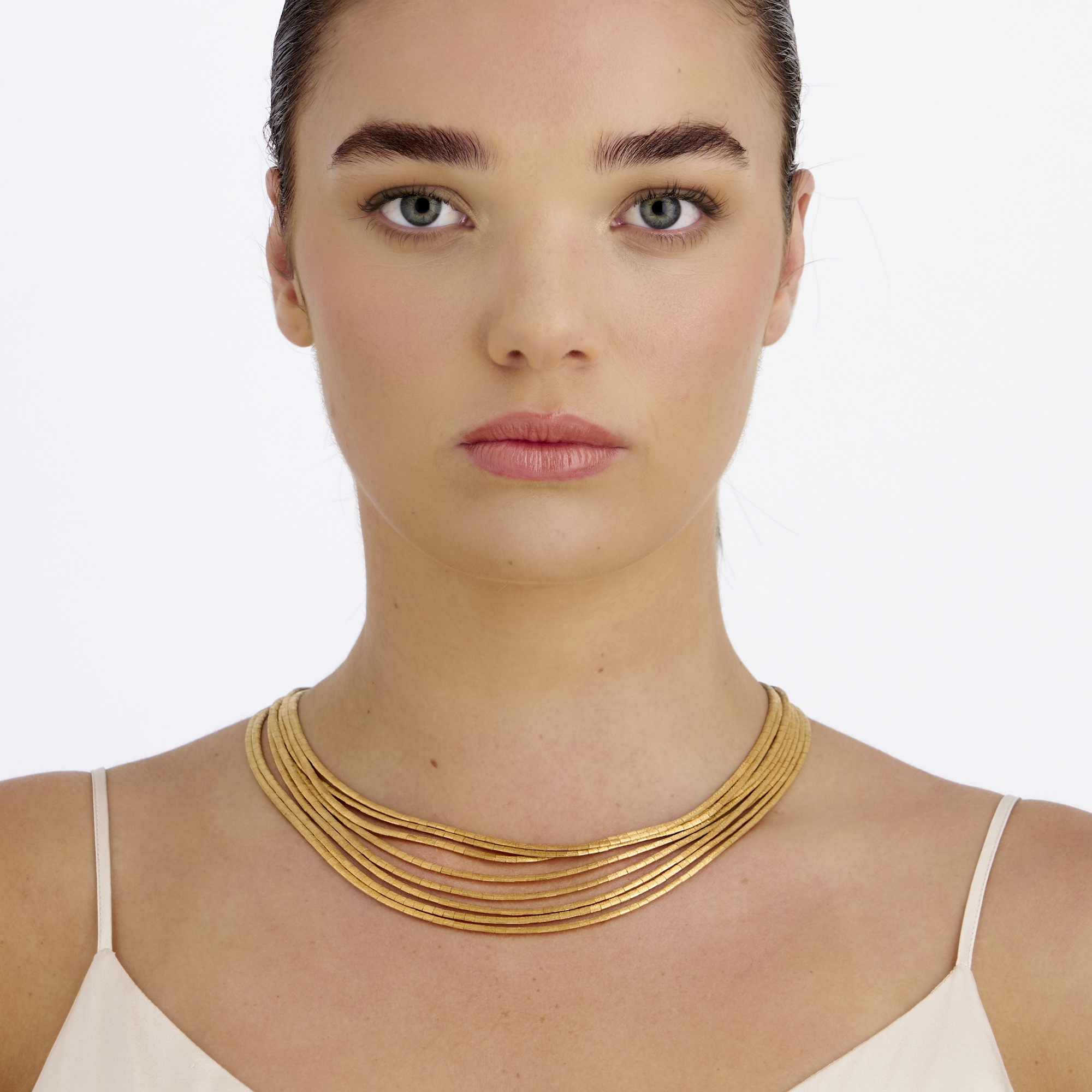 A gold necklace of eight strands of rectangular satin gold serpentine links to an insert clasp and clip, length approximately 460mm, gross weight approximately 128.0 grams.