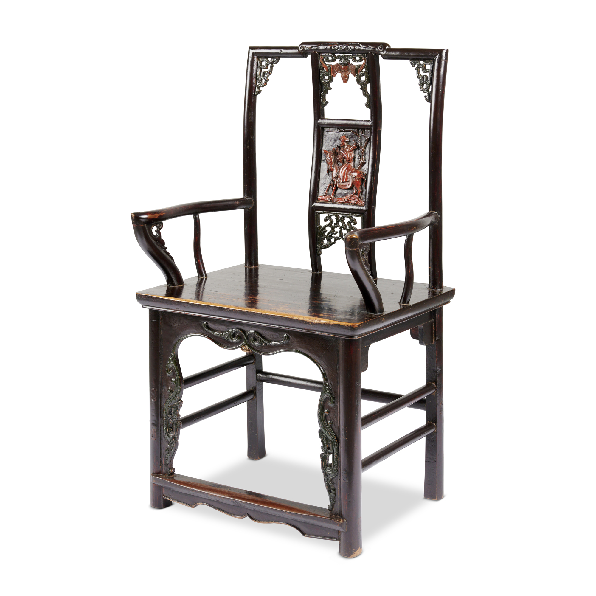 Of classical official's hat chair (guanmaoyi???) form, the chair has a tall three-section back splat. The central inset with a red-lacquer relief of a scholar holding a lute on a donkey beneath a pine tree, an emblem of virtue, longevity, and scholarly reclusion. The upper and lower openwork motifs feature an upside-down bat and double dragons amid clouds respectively, alluding to arriving good fortune (fudao??) and enduring blessings. A shaped apron, largely solid but accented with relief and openwork dragon motifs, anchors the plain seat and adds gravitas. Rooted in late-Ming structure, yet enriched with Qing decorative imagery, this piece blends bold narrative high relief and delicate openwork objects creating a vivid visual scene. The cinnabar lacquer enriches the chair with rare beauty and auspicious symbolism, reflecting material luxury. This chair would have stood in a principal reception hall as a sign of authority and cultivated taste.