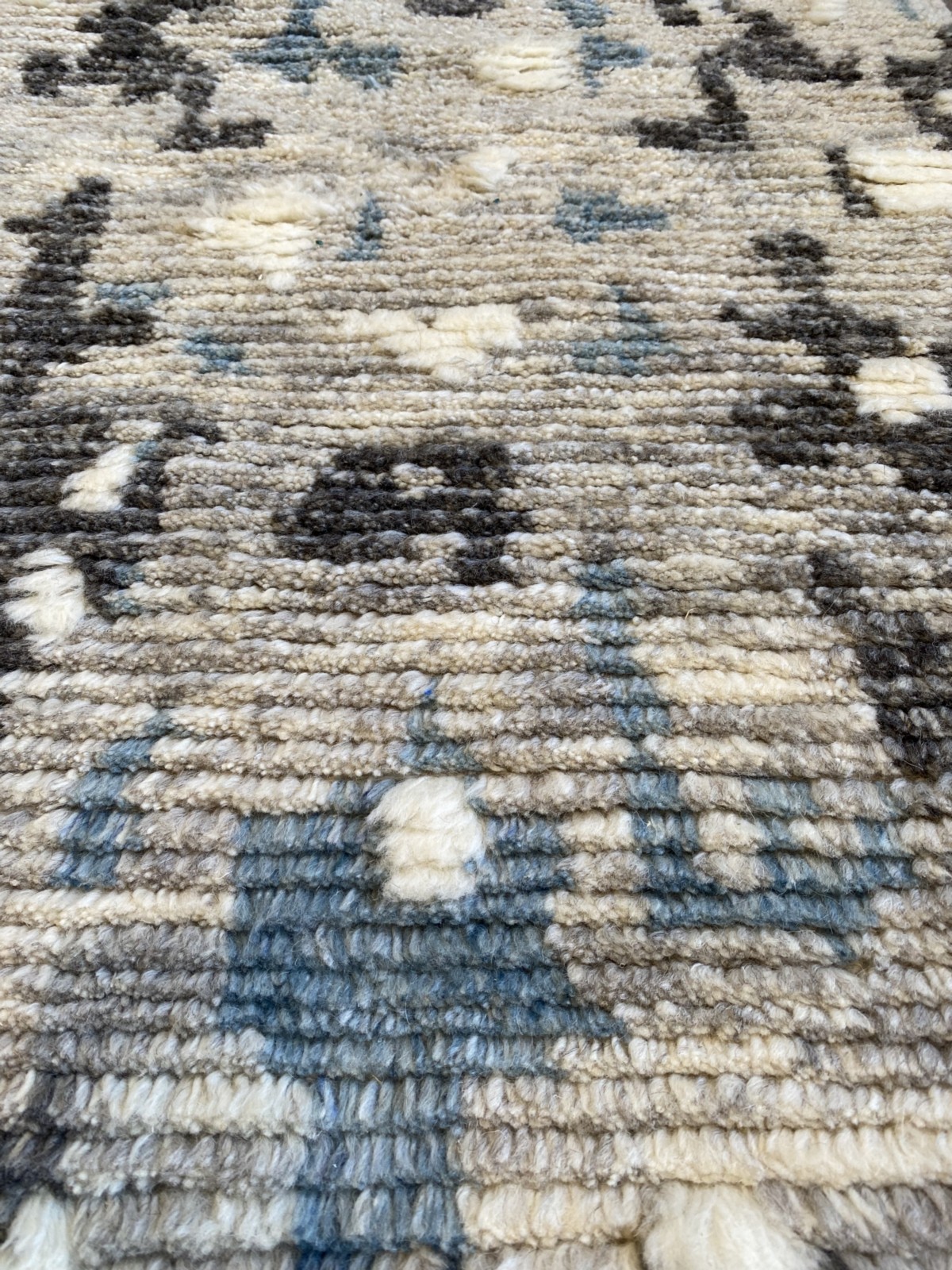 WOOLLEN WARP, WEFT & PILE. HAND-KNOTTED. SOFT PLUSH PILE IN CREAM ABSTRACT BLUE, LIGHT GREY & DARK GREY PATTERNS.