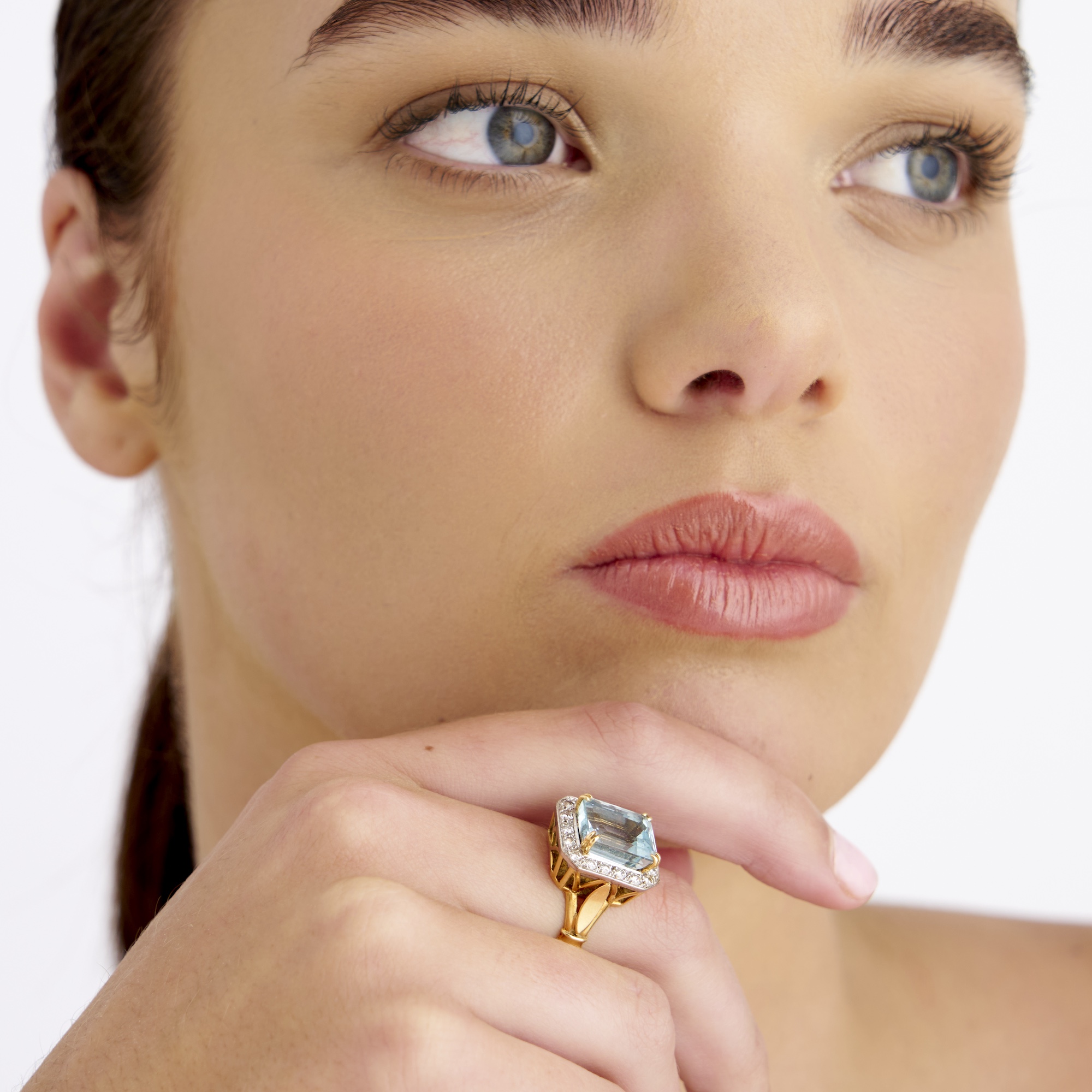 The central aquamarine gemstone contains small chips on the girdle.