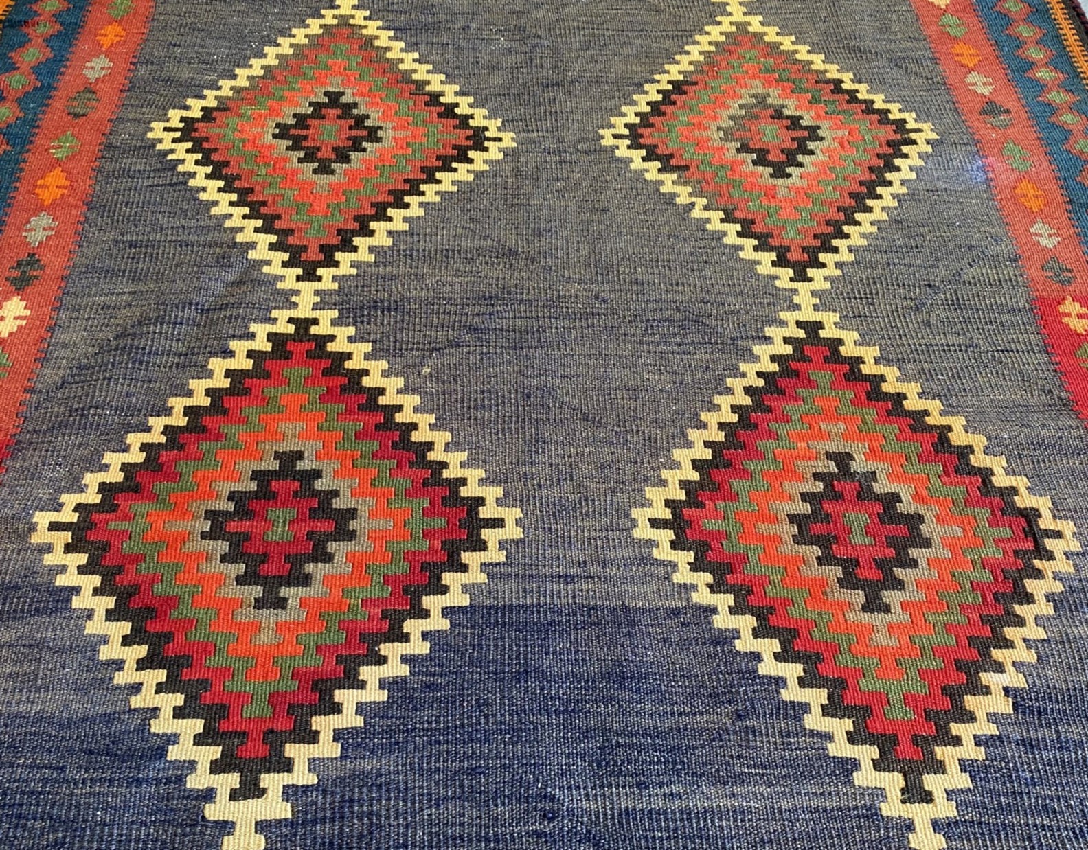 WOOL AND NATURAL VEGETABLE DYES. HAND WOVEN NOMADIC WEAVE FROM THE SOUTHERN PERSIAN FARS PROVINCE WITH DOUBLE ROWS OF REPEATING DIAMOND-SHAPED MEDALLIONS IN VIBRANT SHADES.
