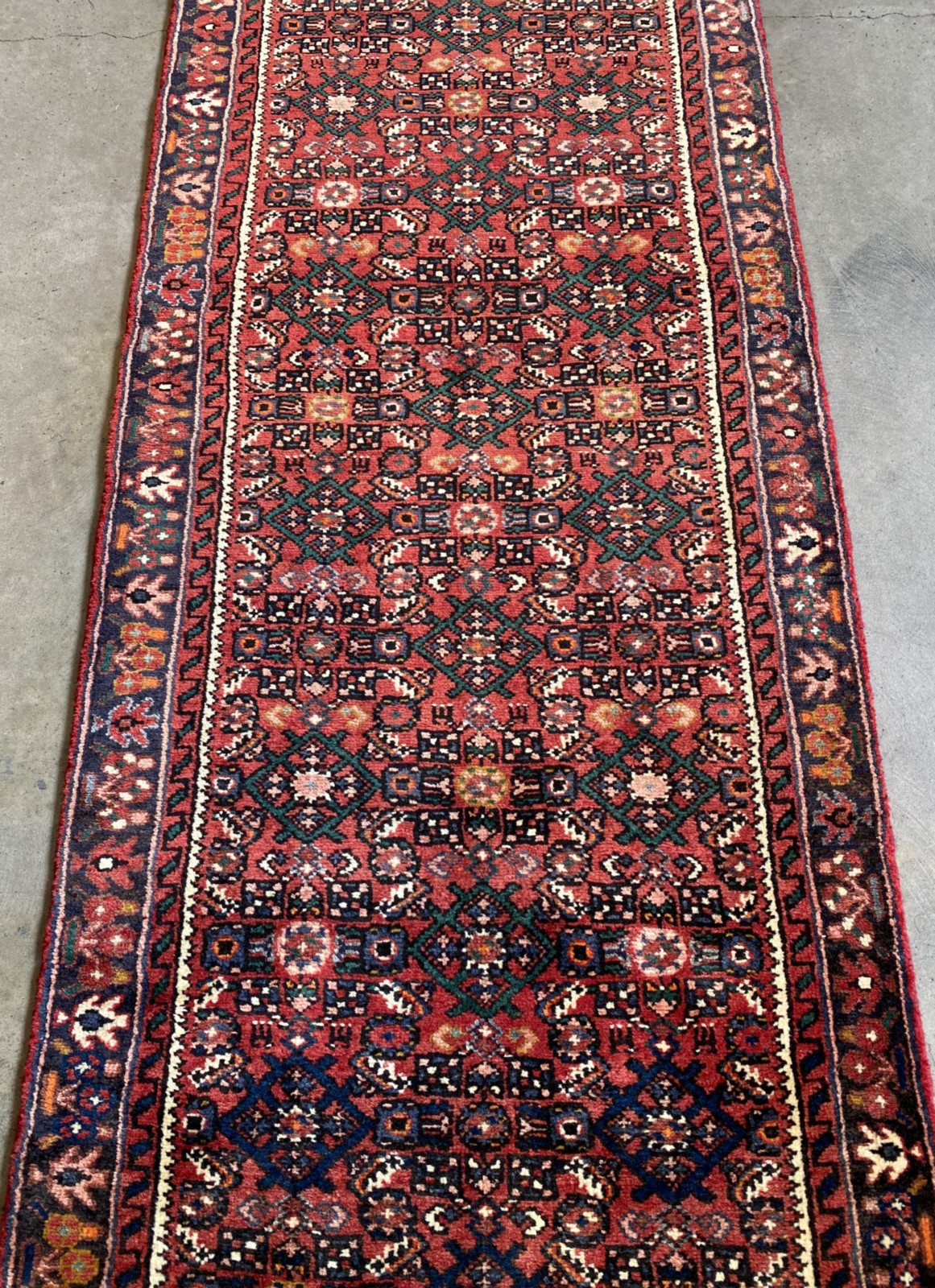 WOOLEN PILE. SOLID HAND-KNOTTED VILLAGE WEAVE FROM THE HAMADAN PROVINCE WITH DESIGN OF ALL-OVER HERATI MAHI MOTIFS. FLORAL-PATTERNED BORDER. THE ENTIRE IN SHADES OF RED, GREEN, BLUE & CREAM.