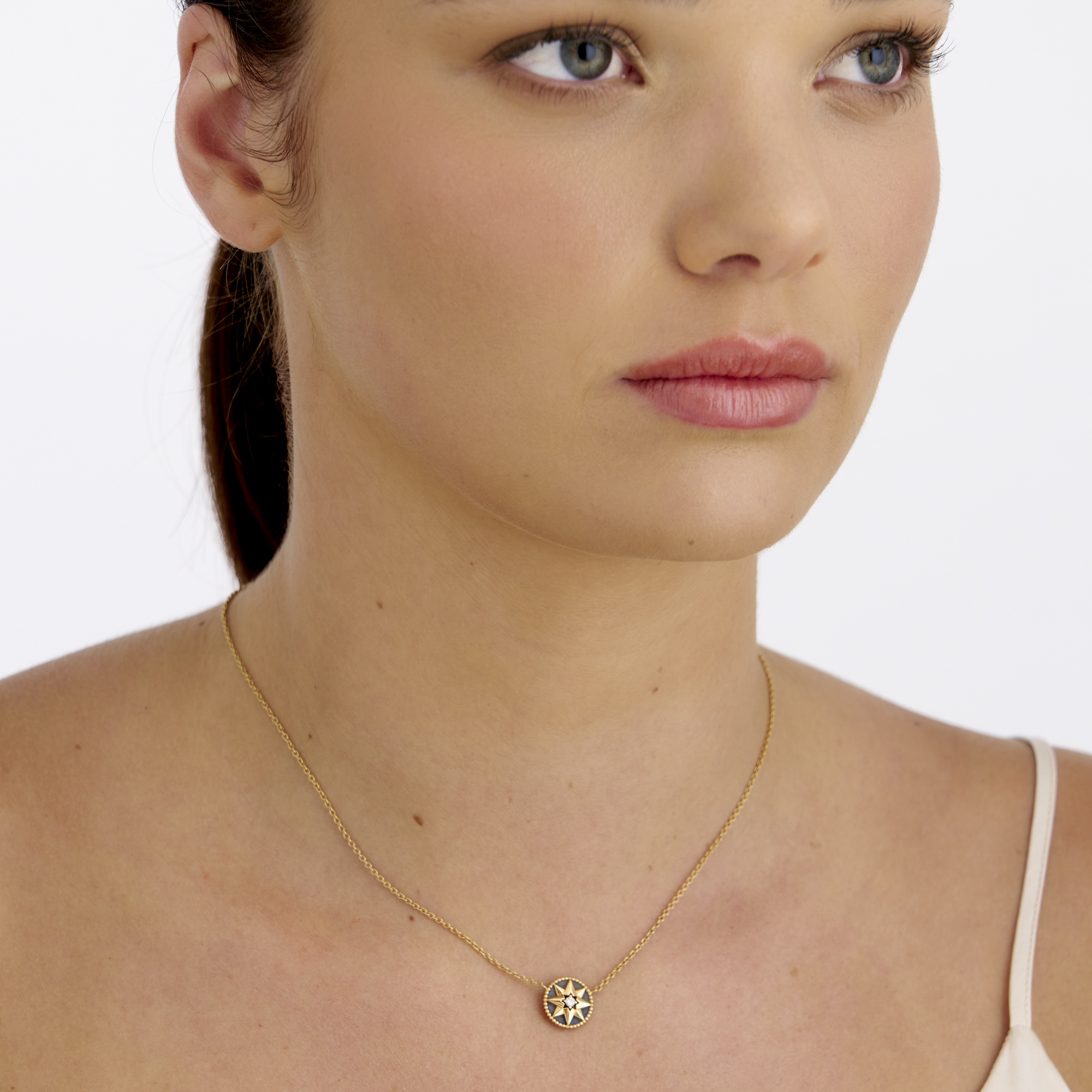 Centring a reversible fixed pendant of lapis lazuli with a beaded edge, reverse is an eight pointed star centring a four claw-set round brilliant cut diamond of approximately 0.03 carats to a bolt ring and three adjustment rings, length approximately 410mm, gross weight approximately 4.1 grams.