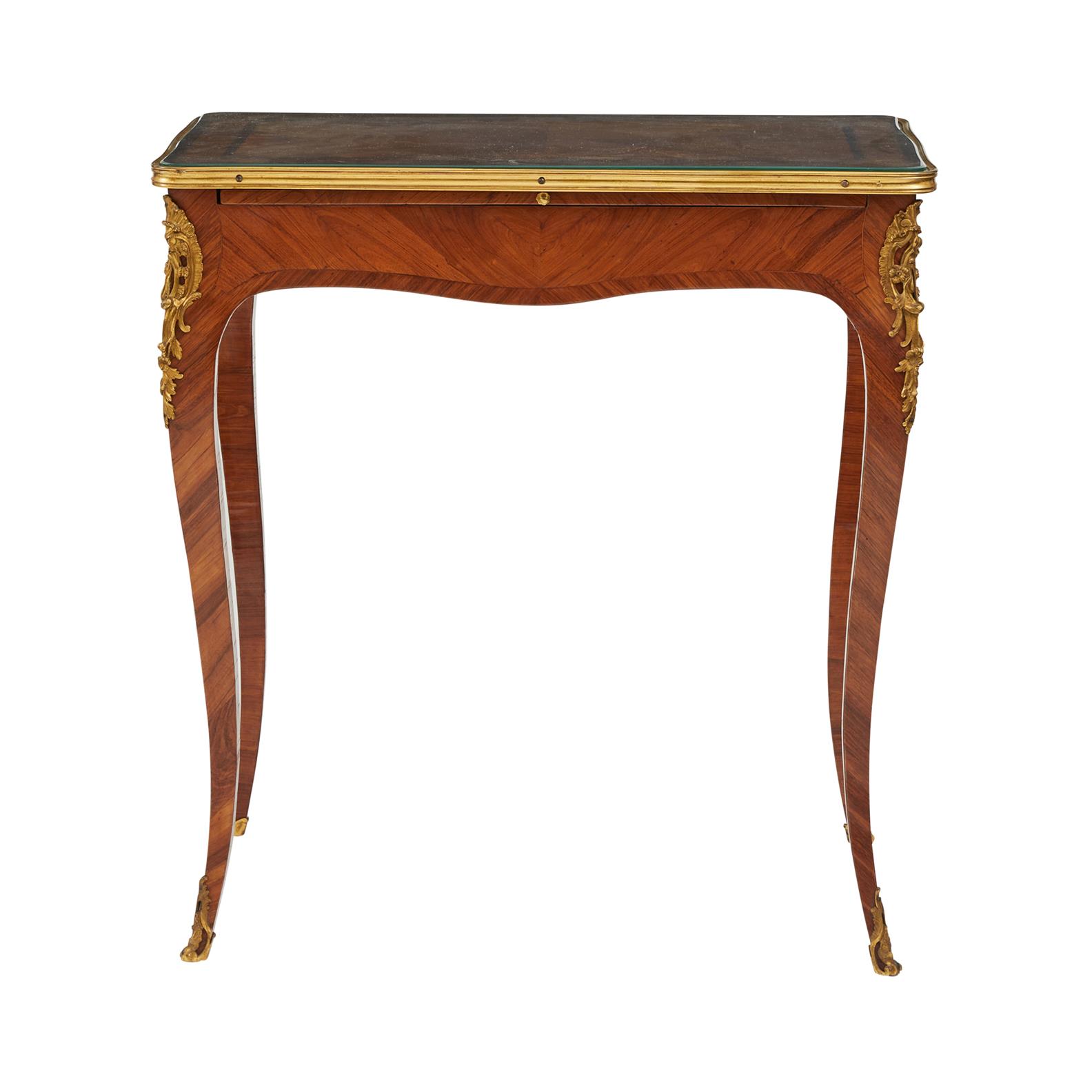 Circa 1760, the quarter veneered rectangular top with bands of kingwood and amaranth, having ormolu moulded edge, with leather lined slide and a fitted end drawer, on cabriole legs with rocaille clasps and sabots.