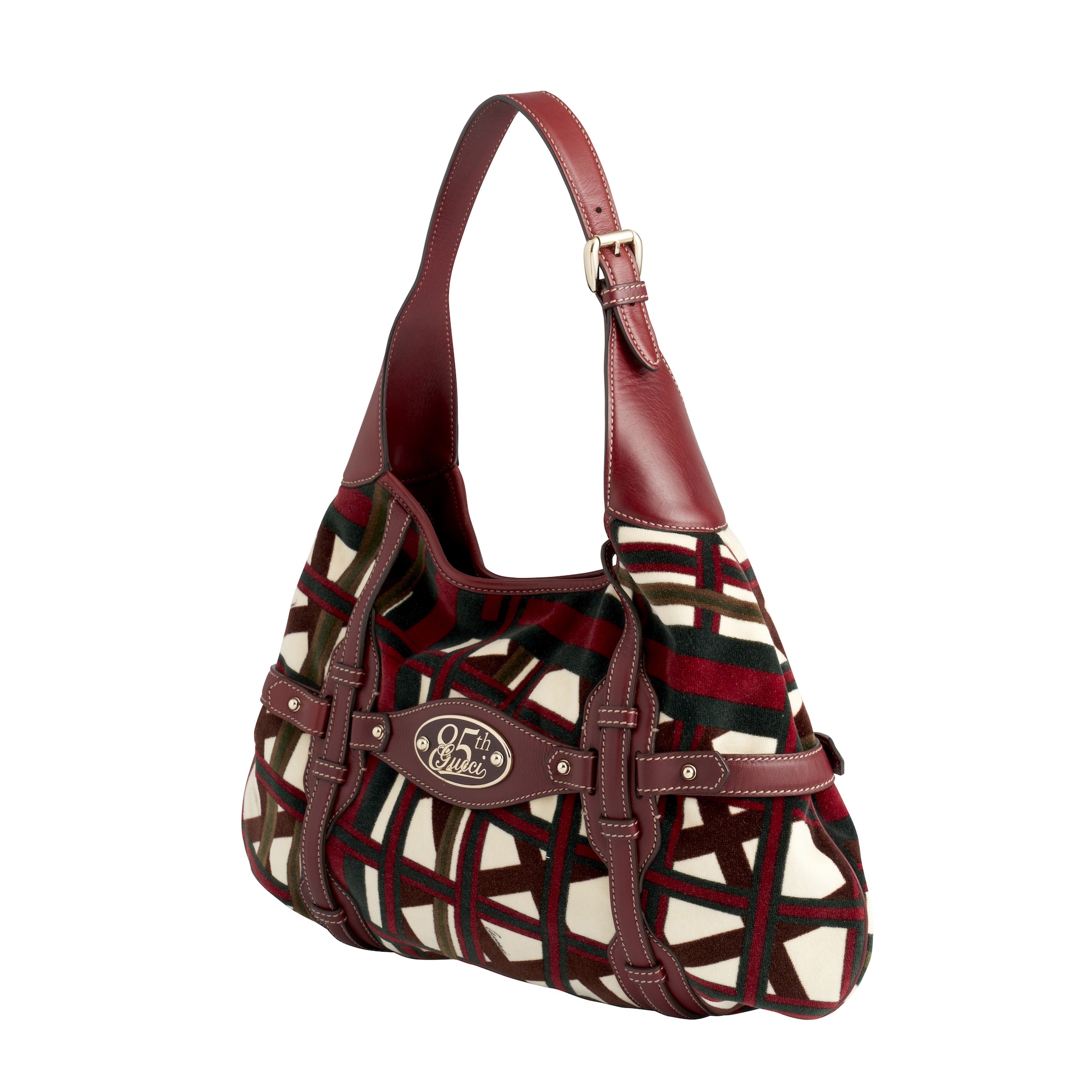Styled in printed cream velour with dark red leather trim and silver tone hardware, featuring contrast stitching and enamel logo plaque, measures 42 x 30 x 1.5 cm