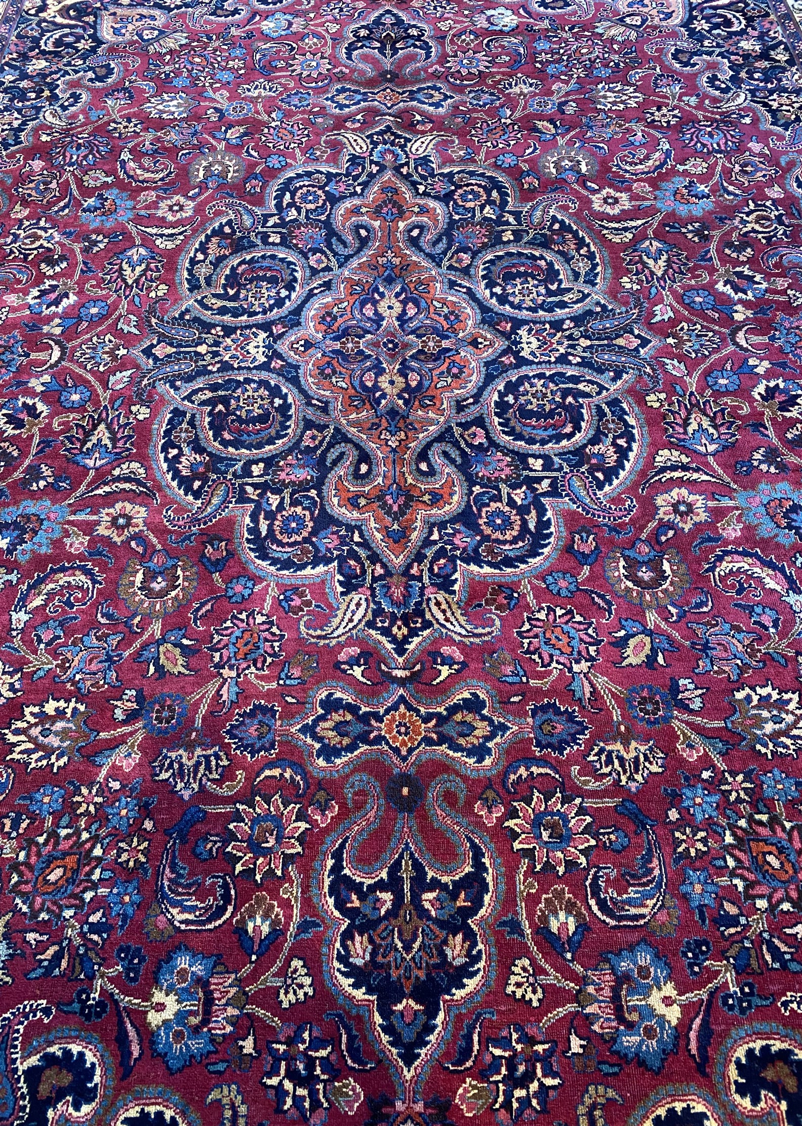 GALLERY EXHIBITED, DENSE WOOLLEN PILE. HAND-KNOTTED "AKHAVAN" MASTER ATELIER WEAVE FROM THE KHORASAN PROVINCE WITH A BOLD ANCHORED FLORAL MEDALLION & QUARTERED CORNER MEDALLIONS WITH URNS BEARING FLORAL FOLIAGE & PAISLEY MOTIFS IN A FIELD OF PALMETTES & FLORAL MOTIFS. BORDER OF CARTOUCHES BEARING PALMETTES. THE ENTIRE IN SHADES OF RUBY RED, INDIGO, CREAM & CORNFLOWER BLUE.
