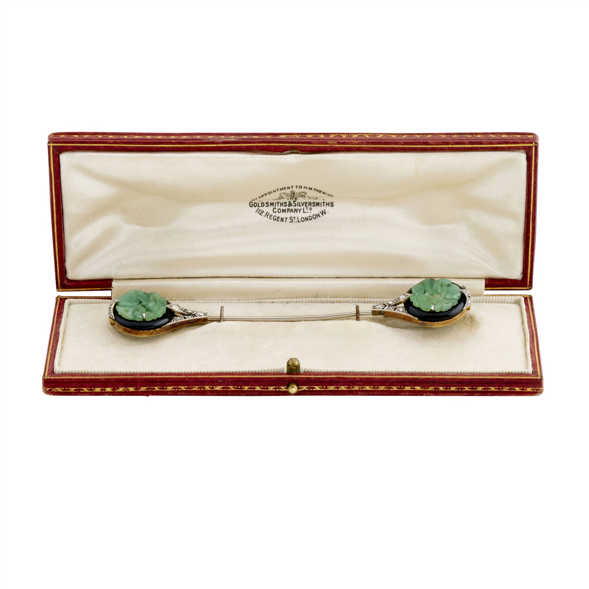 Art Deco Jabot pin with a bejewelled motif to the ends, styled as a pair of circular carved jadeite panels, surrounded by a half round circlet of black onyx raised on a double railed under-bezel, both panels enhanced by platinum millegrain edging with flared terminals of nine rose-cut diamonds to a platinum surette pin, the diamonds together weigh approximately 0.18 carats, length approximately 10mm, gross weight approximately 8.8 grams.