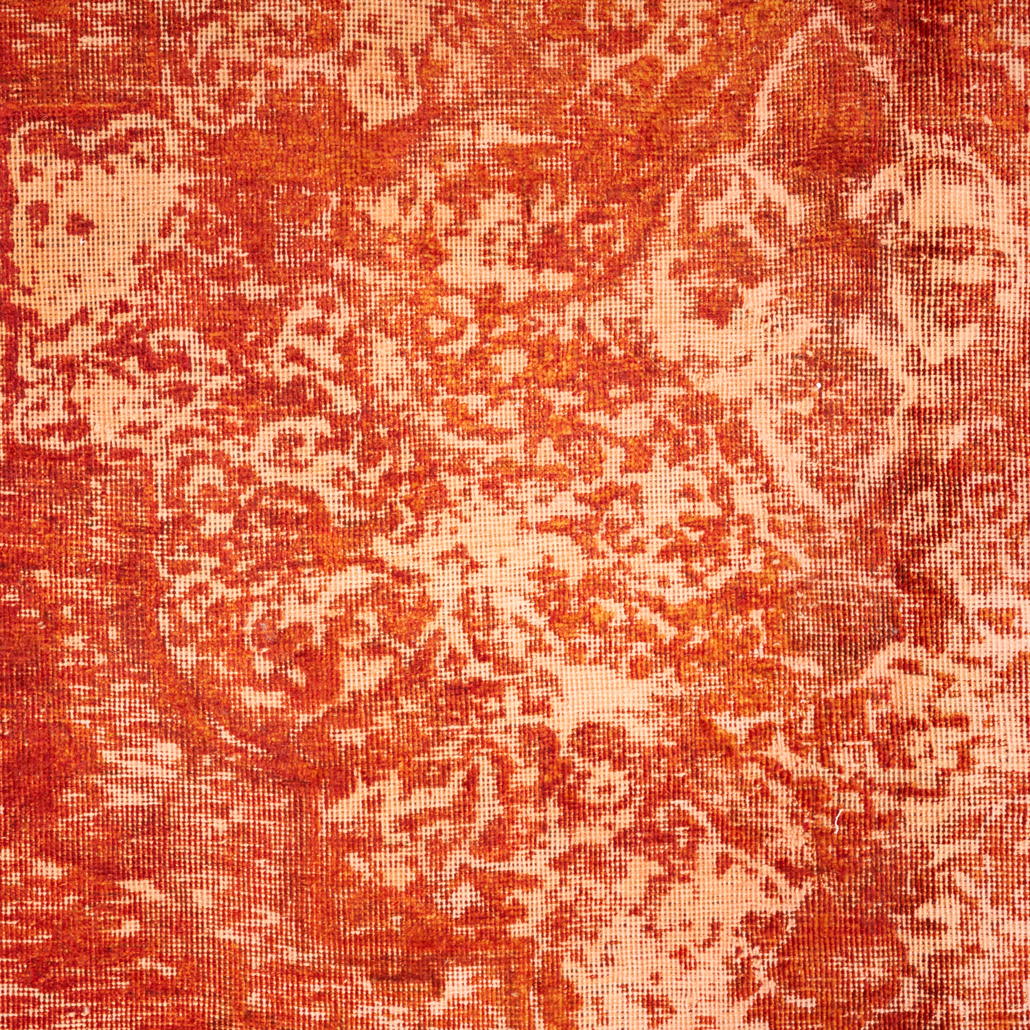 VINTAGE PILE WITH EMBOSSED PATTERNS. A UNIQUE MODERN RUG CREATED FROM AN ORIGINAL HAND-KNOTTED MEDALLION DESIGN KERMAN CARPET, UNIQUELY OVER-DYED IN VIBRANT SHADES OF RED & BURNT ORANGE.