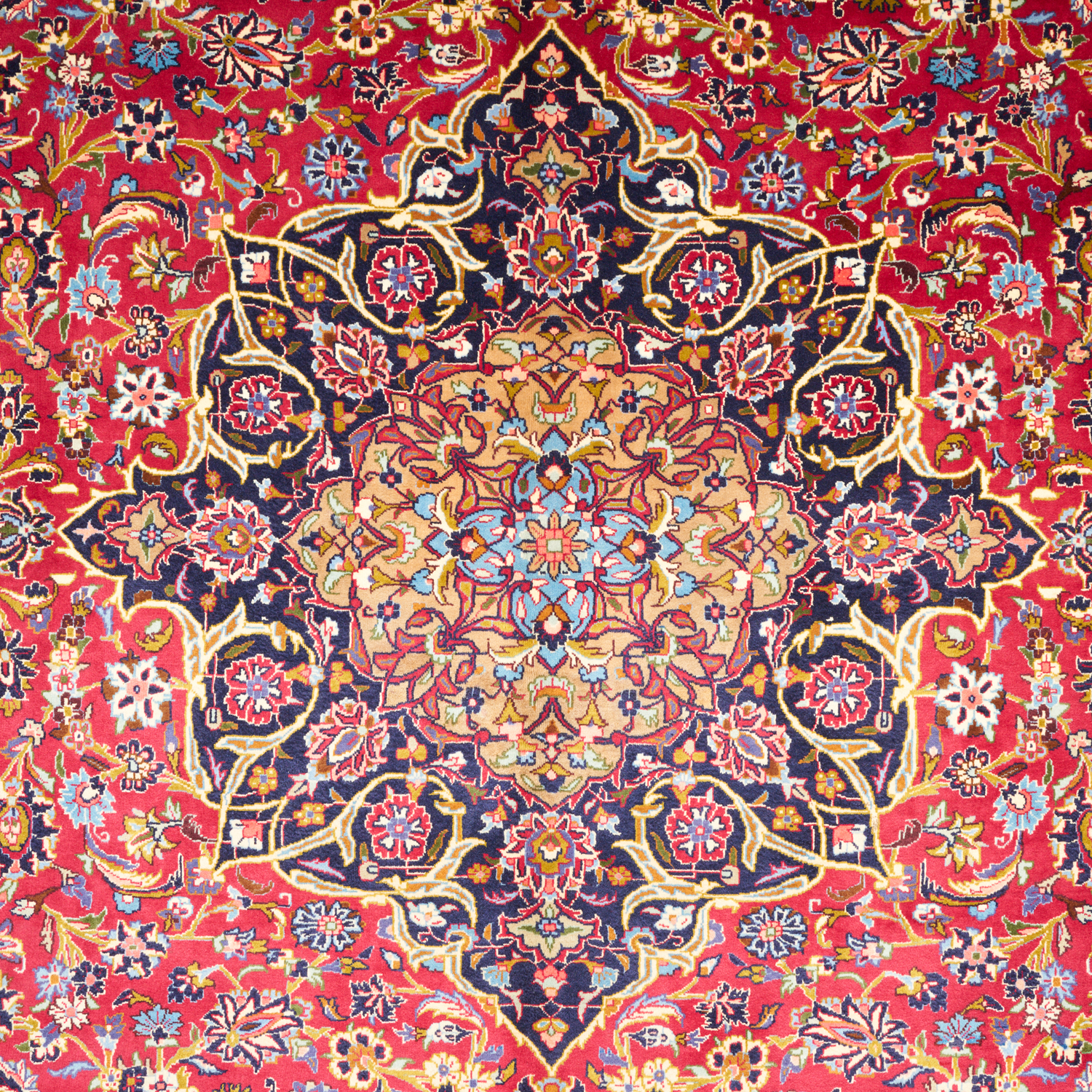 LAMB'S WOOL (KORK) PILE. HAND-KNOTTED CITY WEAVE FROM THE ISFAHAN PROVINCE WITH CLASSIC KASHAN BOOK COVER DESIGN OF A FLORAL MEDALLION OF PALMETTES & QUARTERED CORNER MEDALLIONS WITHIN A FIELD OF SHAH ABBASSI PALMETTES, BLOSSOMING FLORAL SPRAYS AND SAZ LEAVES. WIDE BORDER OF PALMETTES & SAZ LEAVES. THE ENTIRE IN HUES OF RUBY RED, INDIGO, AZURE-BLUE & CREAM.