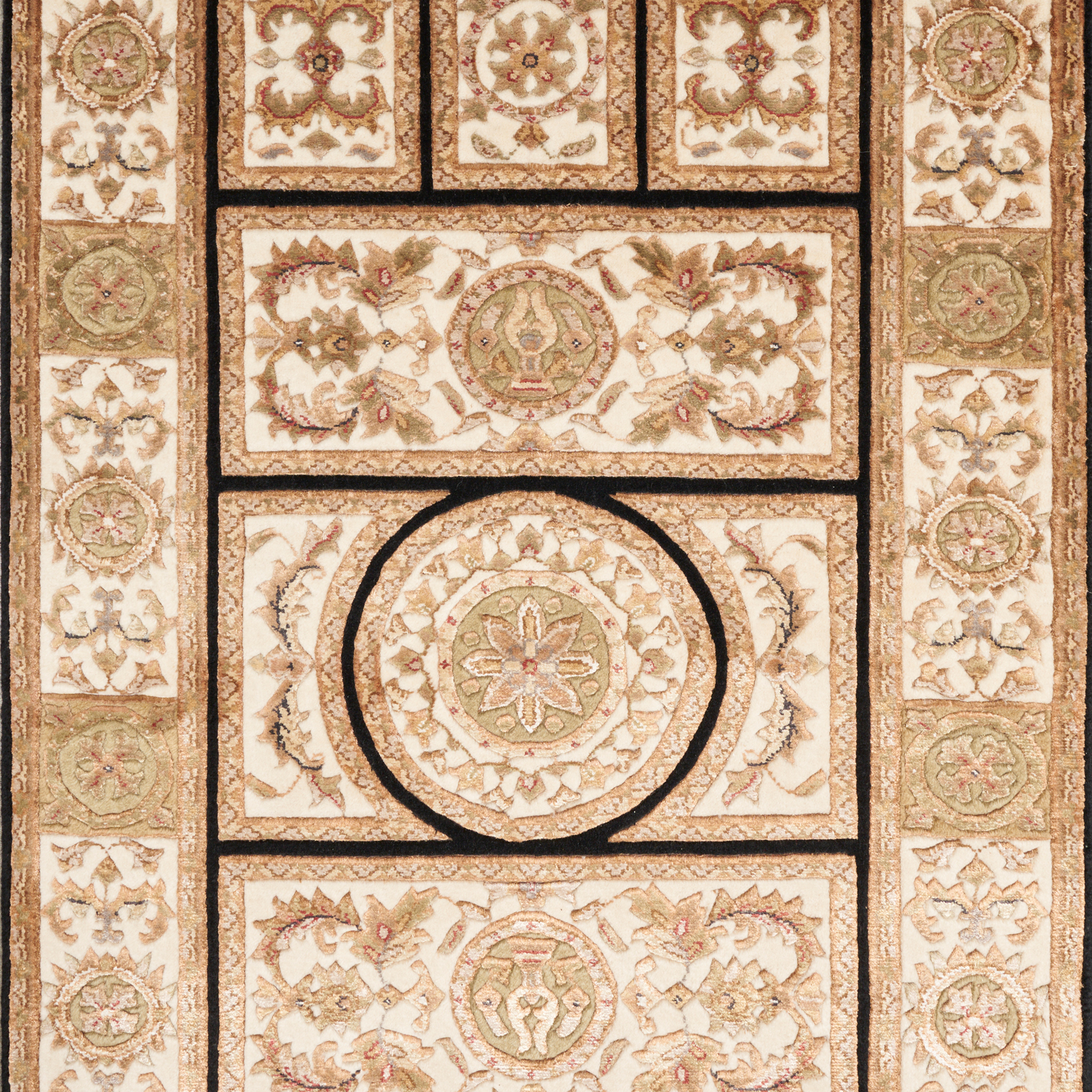 FINE QUALITY WOOL PILE INTER-KNOTTED WITH SILK. FINELY HAND-KNOTTED WEAVE. CLASSIC FRENCH RENAISSANCE DESIGN OF A CIRCULAR CENTRAL MEDALLION CONTAINING A FLORAL MOTIF IN A SYMMETRICAL PANELLED FIELD OF CIRCULAR RENAISSANCE PANELS SET AGAINST ORNATE RAMBLING LEAF FORMS. THE ENTIRE IN SHADES OF ONYX, CREAM, OLIVE & PEACH.