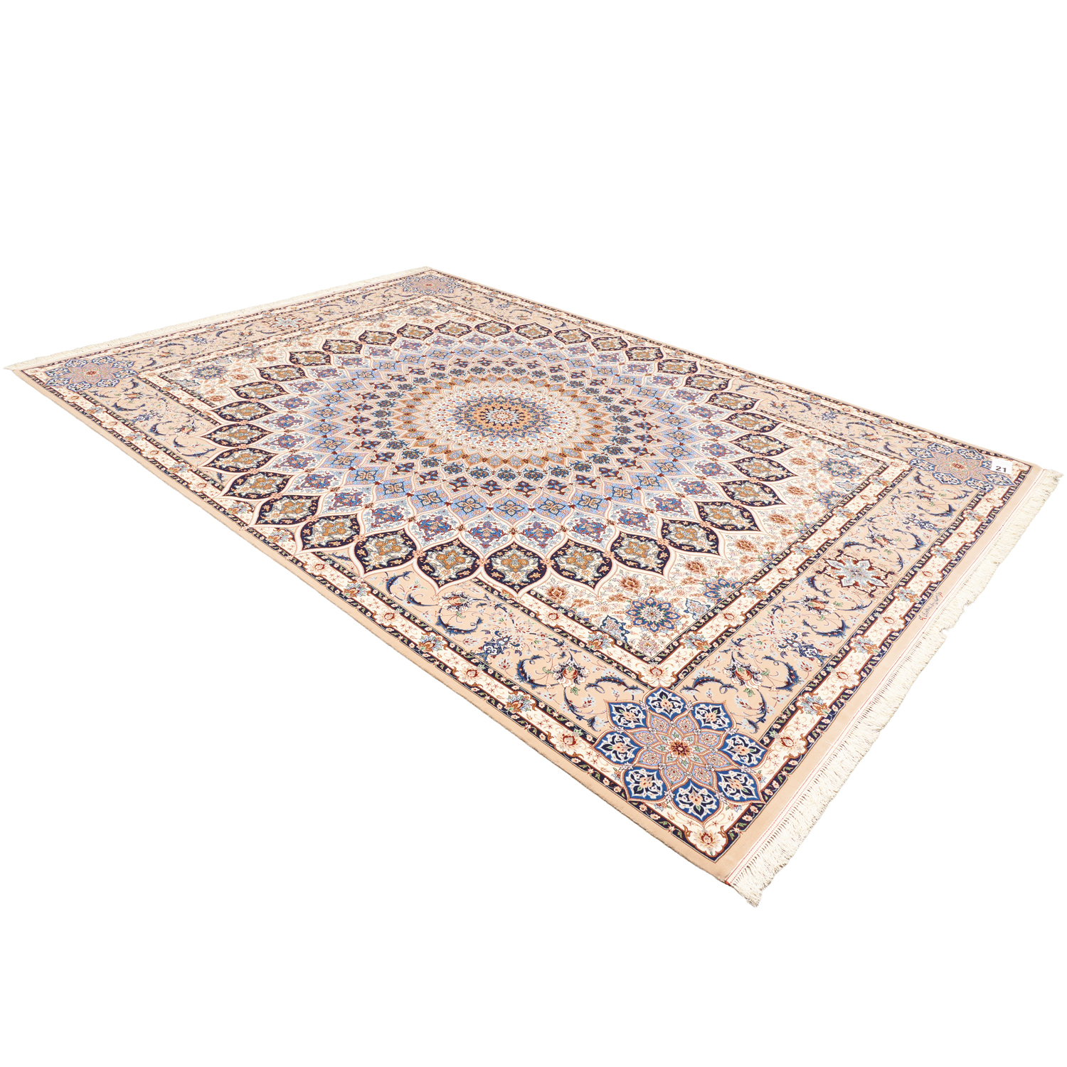 SILK FOUNDATION. HIGH QUALITY LAMB'S WOOL PILE (KORK) HEAVILY INTER-KNOTTED WITH SILK. FINELY HAND-KNOTTED WEAVE OF 750,000 KNOTS PER SQUARE METER BY "DAVARI" MASTER WEAVING ATELIER. SIGNED PIECE. CLASSIC ISFAHAN GONBAD (DOME) DESIGN DEPICTING THE INTERIOR FAÇADE OF A MOSQUE DOME WITH A SYMMETRICAL DESIGN WITH PATTERNS RADIATING OUTWARDS FROM THE CENTRAL MEDALLION AND FEATURING ELABORATE MOSAIC MOTIFS. ROSETTES & PALMETTES IN CORNER MEDALLIONS. BORDER OF URNS BEARING PALMETTES & SAZ LEAVES. THE ENTIRE IN SHADES OF LIGHT TAUPE, CREAM, INDIGO, AZURE & MIDNIGHT BLUES & COPPER BROWN WITH BORDEAUX RED HIGHLIGHTS.