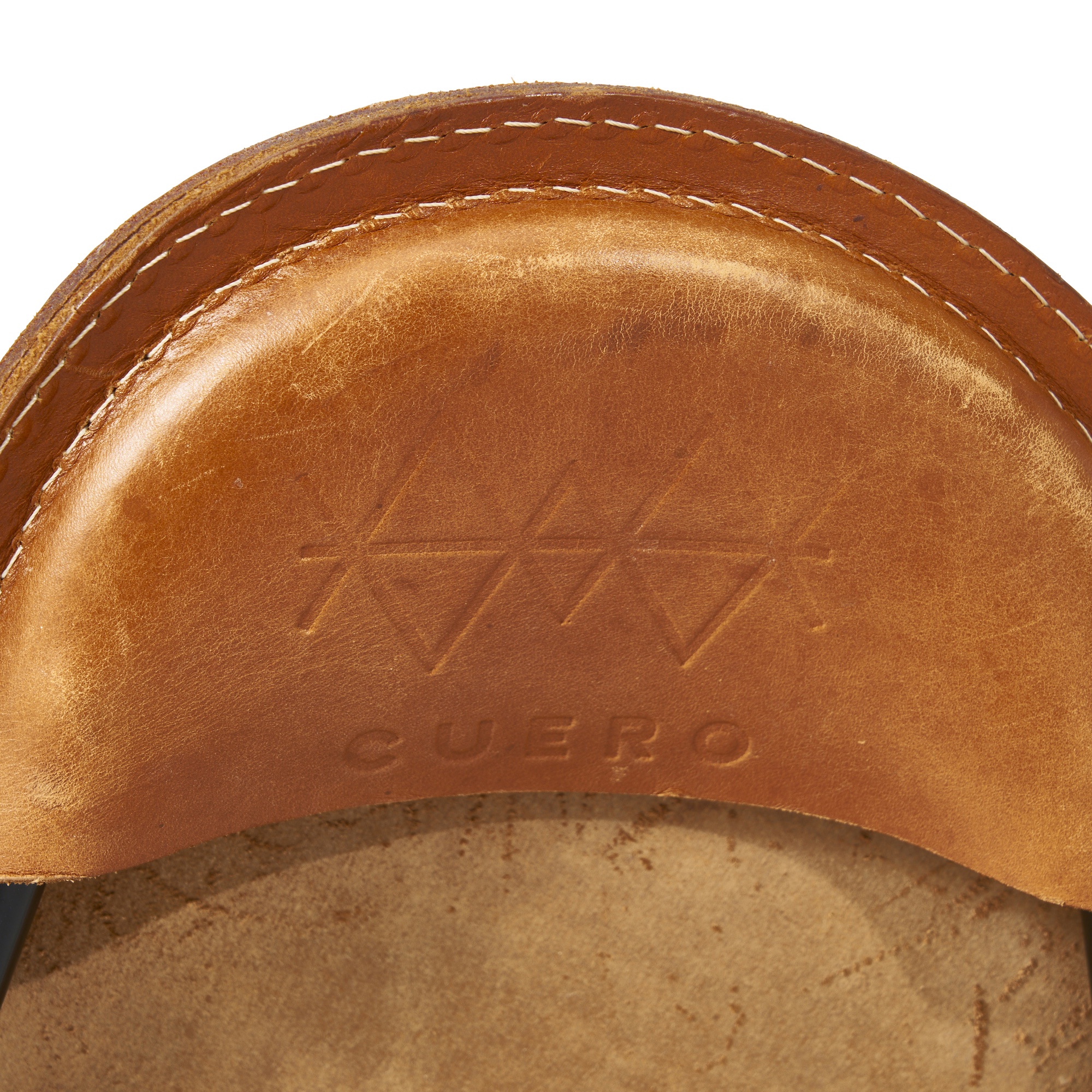 The tan leather sling has noticeable water marks to the front and rear where water has touched the aniline leather. Front left lower sling has noticeable water mark. The rear folds over the upper metal arms have light wear consistent with use. The leather sling is in good structural condition. The steel frame is in good condition with light scuffs to base consistent with use.