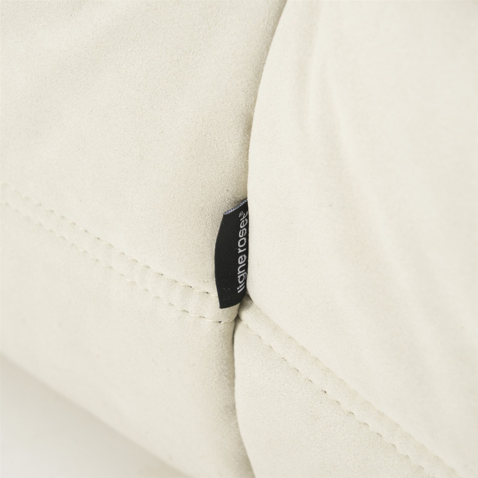 In bone micro suede upholstery with pleats of folded fabric. Retains manufacturer tag.