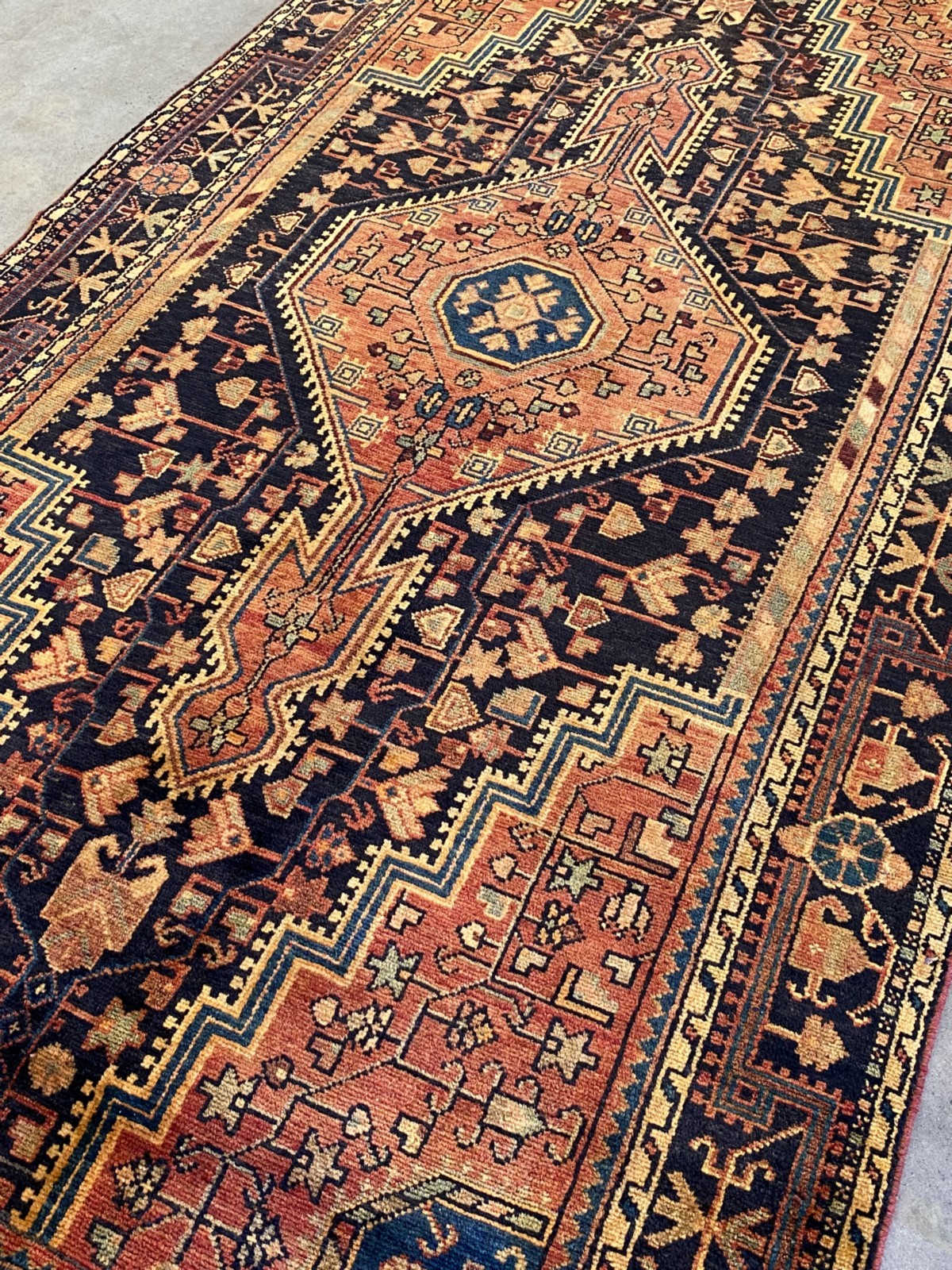 WOOL & VEGETABLE DYES. HAND-KNOTTED VILLAGE WEAVE FROM THE HAMADAN REGION WITH A DISTINCT DESIGN OF CENTRAL HEXAGONAL ANCHORED MEDALLION CONTAINING FLORAL PATTERNS & CORNER MEDALLIONS IN A CHARCOAL FIELD OF FLORAL PATTERNS. BORDER OF ROSETTES & PAISLEY MOTIFS.